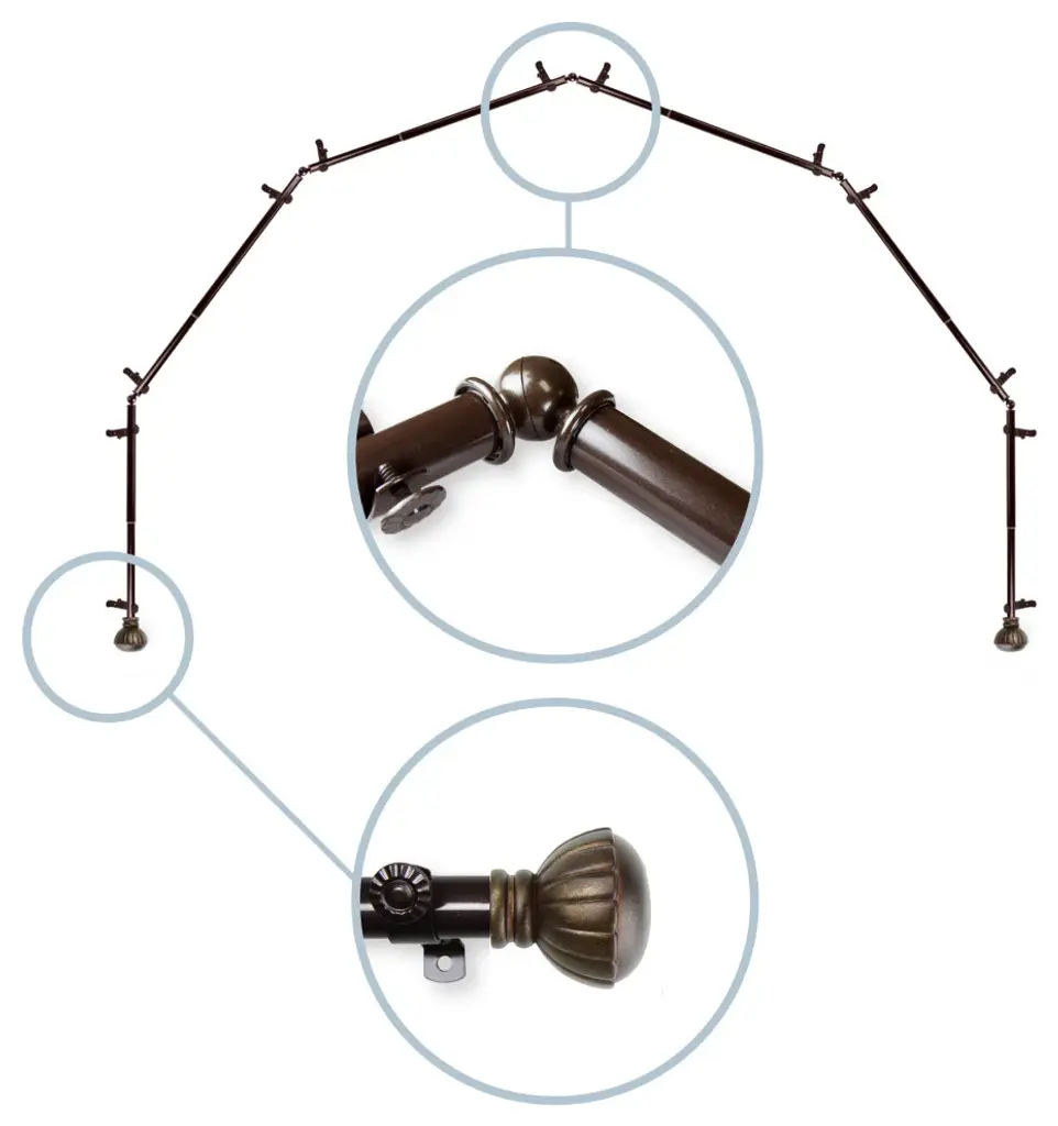 Our Multi Sided Bay Window Rod are the perfect way to decorate a multi-sided bay window with a stylist touch not often found. Offered in 3 different variations, 4, 5 and 6-sided rods can be used for multi window and bay windows. Rods connect using our corner connector which allows for a nearly 360 rotation.Includes six 13/16" diameter rods, 2 finials, 5 corner connectors, and mounting hardwareRod Projection: 2.875"Finial Measurement : 2-1/2" W x 2-1/8" H x 2-1/8" DEach rod extends from 28-48"Steel Rod and Resin Finial Instruction Included