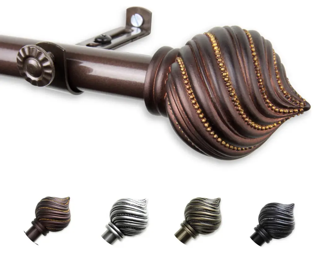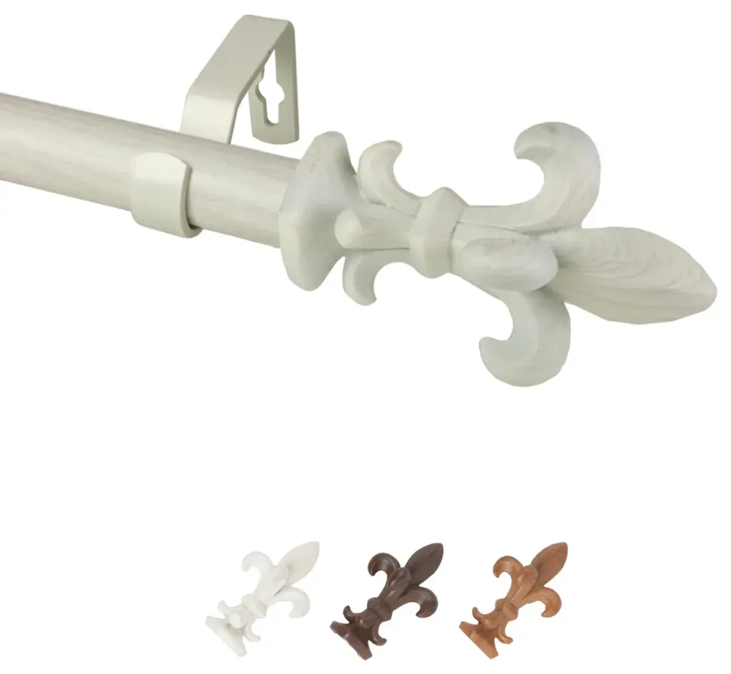 Presenting the newly designed faux wood curtain rod set. Give your window treatment a natural look with this 1 inch diameter rod, beautifully complimenting any window. Includes telescoping steel pole, mounting hardware, brackets, and 2 finials Projection: 3.625" Finial measurement: 4.5" W x 2.25" H x 1.5" D
