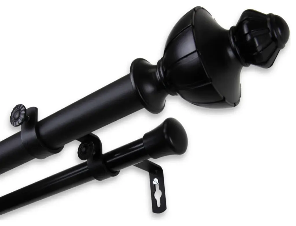 Central Design Products is thrilled to present our top-of-the-line Double Curtain Rods, the ultimate addition to any window treatment. Our high-quality rods are crafted with precision to provide a sleek and modern look to your home decor. Each set includes a double curtain rod, finials, sturdy mounting brackets, and all necessary mounting hardware. The elegant color of our curtain rods adds a touch of sophistication to your space. Upgrade your window treatment with Central Design Products'' Double Curtain Rods today! Includes 1 curtain rod of 1" diameter, one curtain rod of 13/16" diameter, finials, endcaps, mounting brackets, and mounting hardware. Size: 66-120" Projection: 6.75" Front Rod Diameter: 1" / Back Rod Diameter: 13/16" Material: Steel