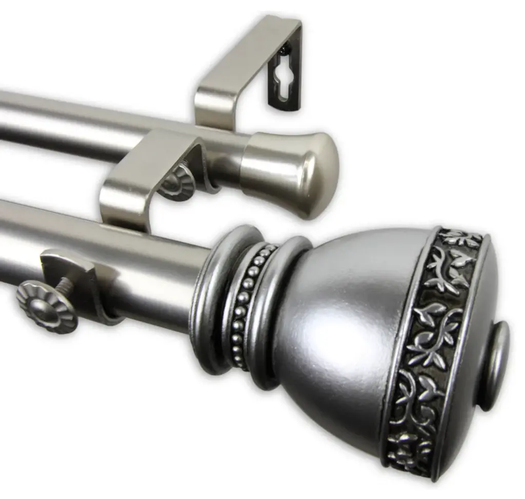 Includes Double Rod, 2 Finials, and Mounting Hardware. Front Rod Projection: 6.75" Back Rod Projection: 3.75" Steel Rod and Resin Finials. Finial Measures: 3.5" x 2.25" x 2.25"