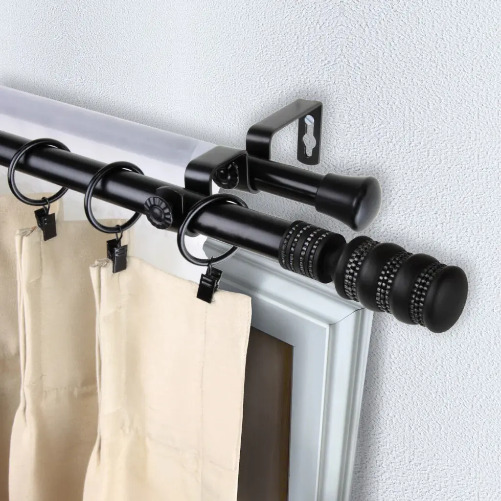 Introduce an elegant touch to your window treatment with this beautiful 13/16" diameter double curtain rod set, made of high quality steel rods. Includes 2 telescoping steel pole, mounting hardware, brackets, and 2 finials Projection: 2.875" Finial measurement: 4" W x 1.4" H x 1.4" D