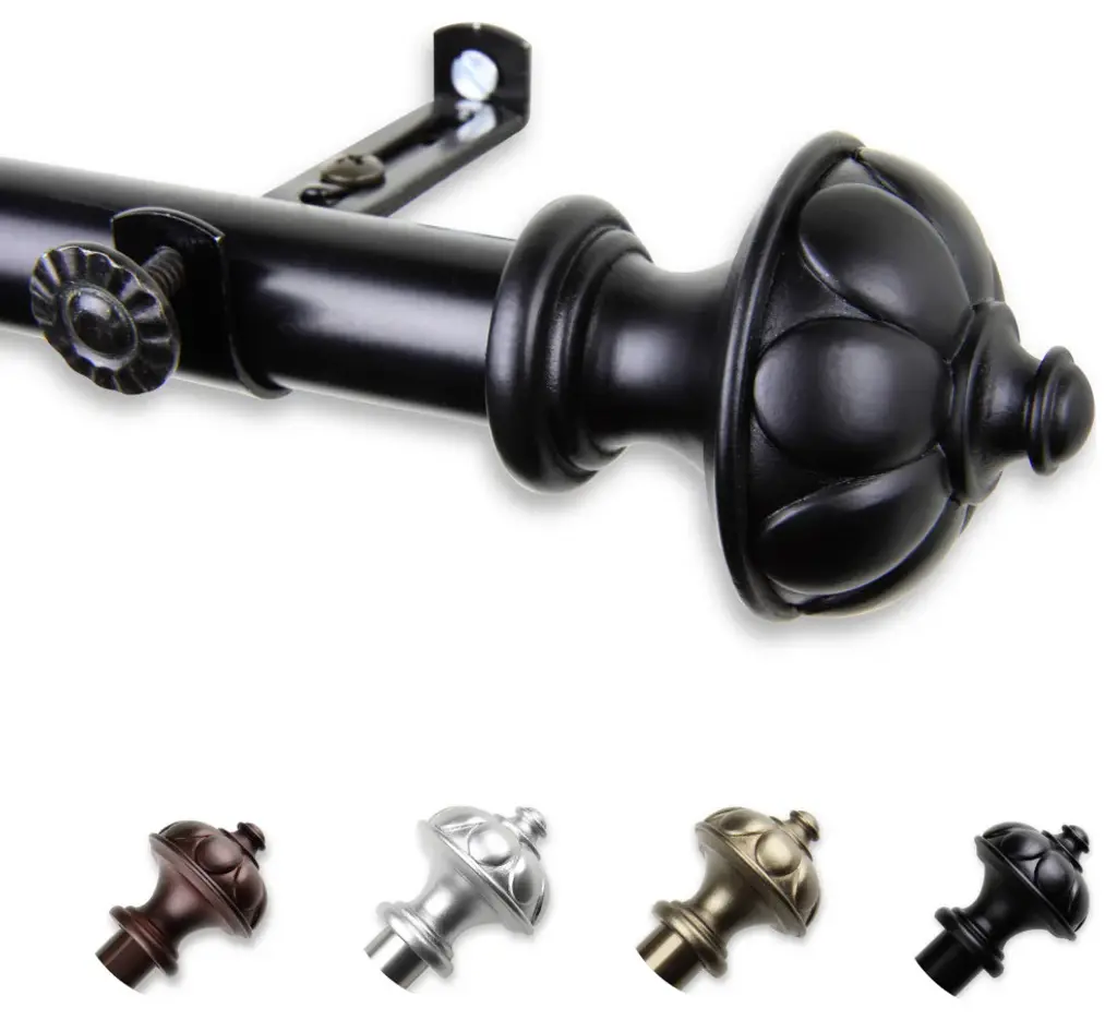 Introduce an elegant touch to your window treatment with this beautiful 13/16" diameter curtain rod set, made of high quality steel rods. Includes telescoping steel pole, mounting hardware, brackets, and 2 finials Projection: 2.875" Finial measurement: 2.5" W x 2" H x 2" D