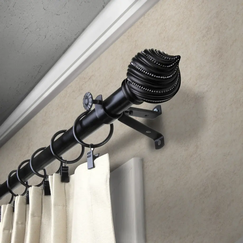 Introduce an elegant touch to your window treatment with this beautiful 13/16" diameter curtain rod set, made of high quality steel rods. Includes telescoping steel pole, mounting hardware, brackets, and 2 finials Projection: 2.875" Finial measurement: 2.5" W x 2" H x 2" D