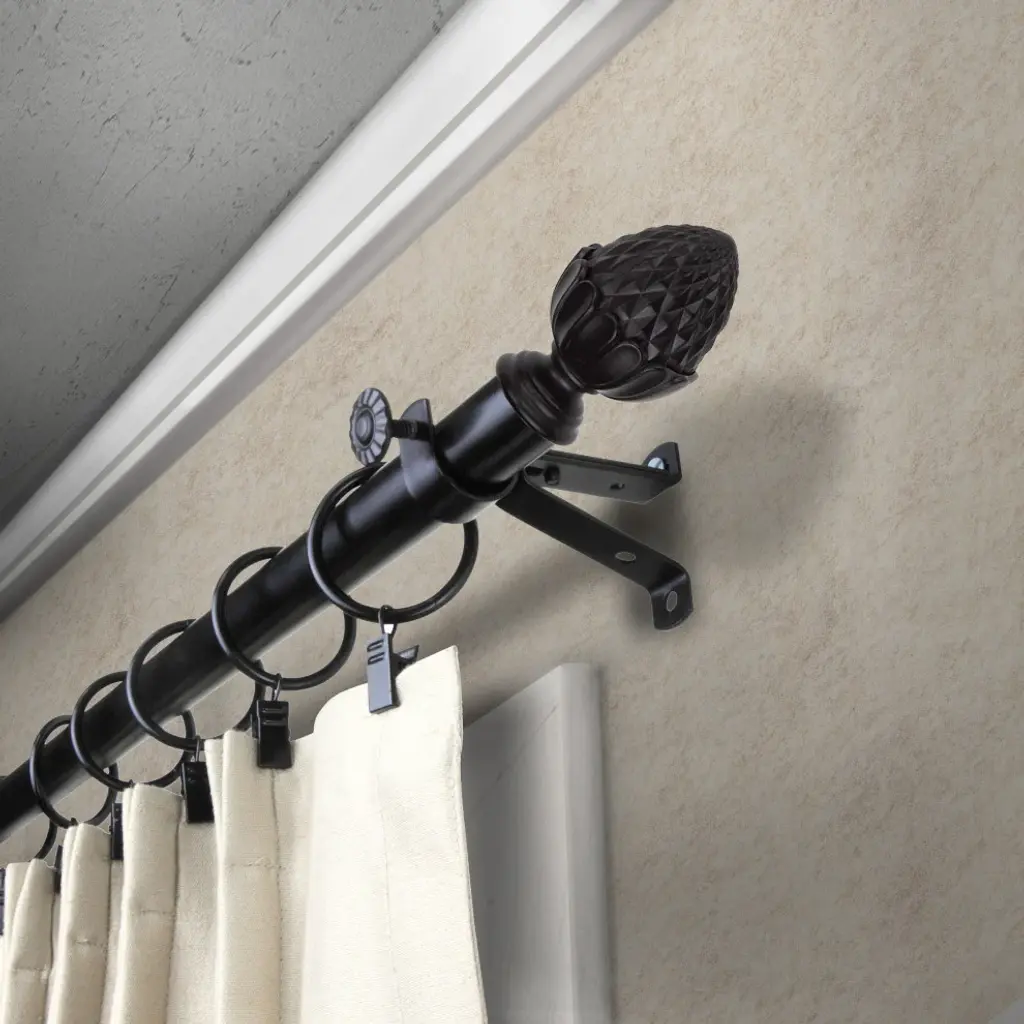 Introduce an elegant touch to your window treatment with this beautiful 13/16" diameter curtain rod set, made of high quality steel rods. Includes telescoping steel pole, mounting hardware, brackets, and 2 finials Projection: 2.875" Finial measurement: 2.5" W x 1.625" H x 1.625" D