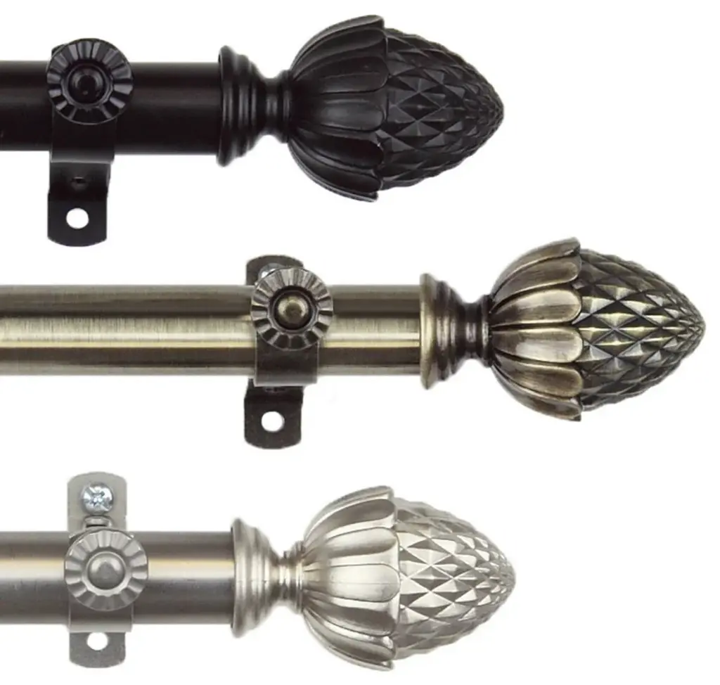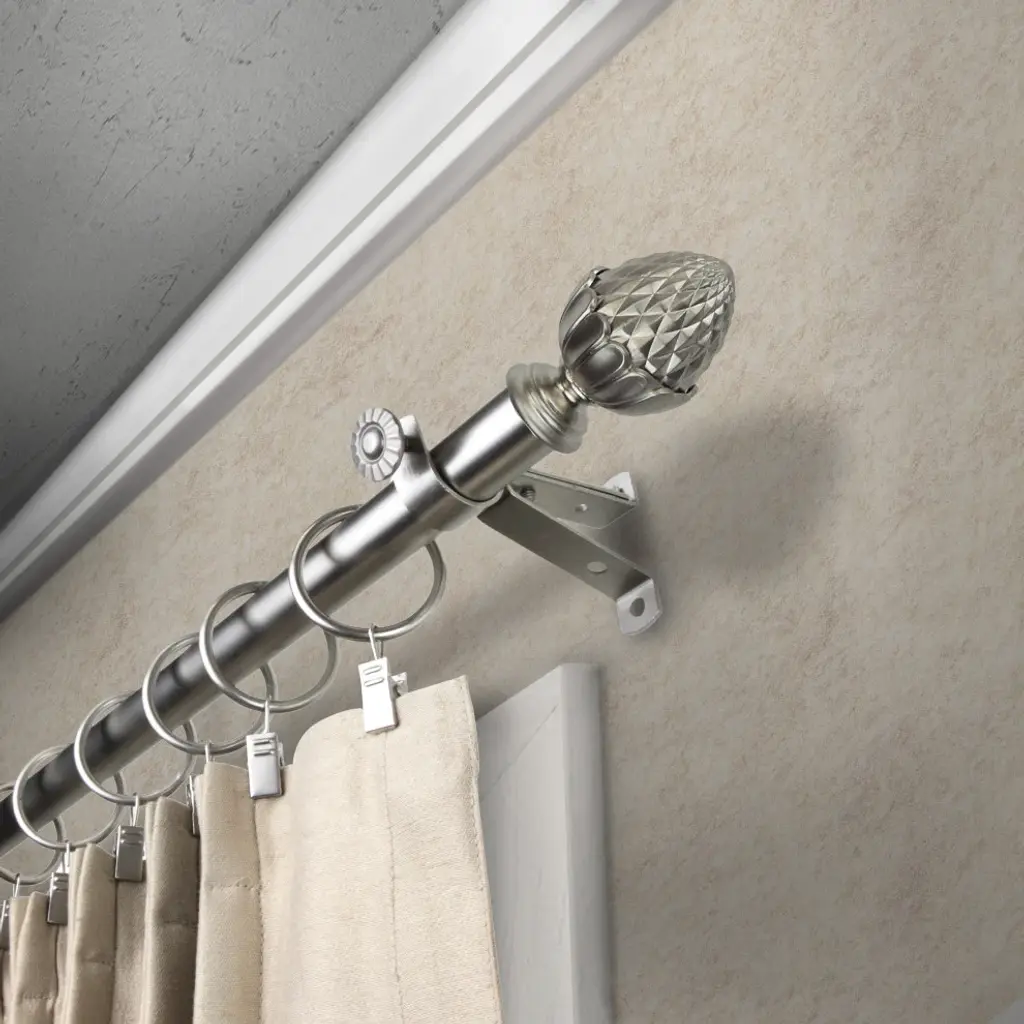Introduce an elegant touch to your window treatment with this beautiful 13/16" diameter curtain rod set, made of high quality steel rods. Includes telescoping steel pole, mounting hardware, brackets, and 2 finials Projection: 2.875" Finial measurement: 2.5" W x 1.625" H x 1.625" D
