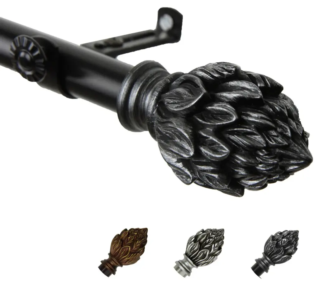 Introduce an elegant touch to your window treatment with this beautiful 13/16" diameter curtain rod set, made of high quality steel rods. Includes telescoping steel pole, mounting hardware, brackets, and 2 finials Projection: 2.875" Finial measurement: 3" W x 1.75" H x 1.75" D