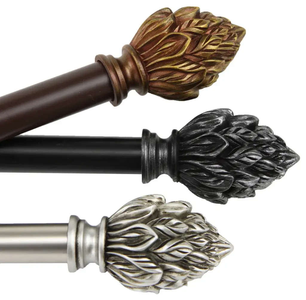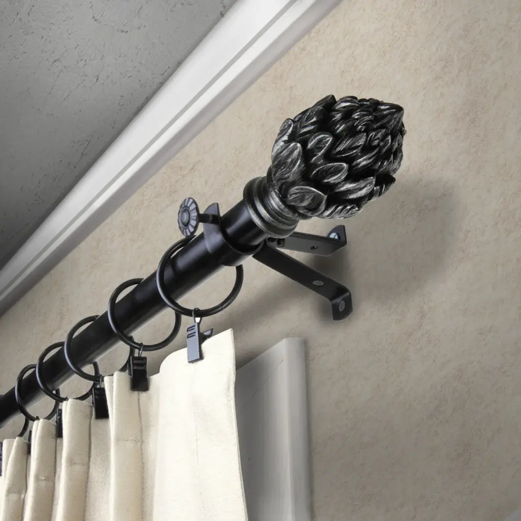 Introduce an elegant touch to your window treatment with this beautiful 13/16" diameter curtain rod set, made of high quality steel rods. Includes telescoping steel pole, mounting hardware, brackets, and 2 finials Projection: 2.875" Finial measurement: 3" W x 1.75" H x 1.75" D