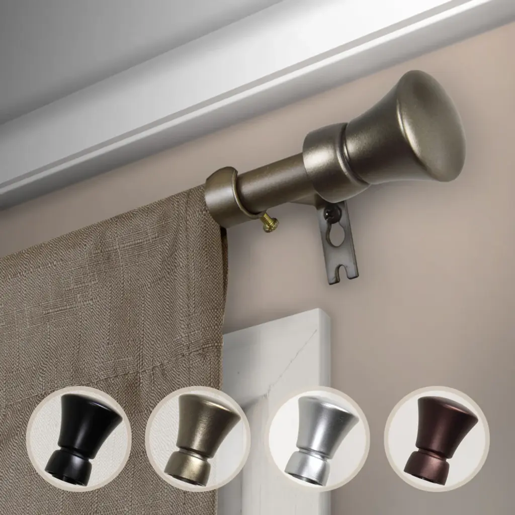 Central Design Products presents the perfect enhancement to your window treatment with high-end quality 5/8" Curtain Rods, Reagan edition. Effortlessly style your window treatment with these Curtain Rods. Designed to add a modern touch to your window decor. Includes 1 curtain rod of 5/8" diameter, 4 support brackets, 2 finials, and mounting hardware. Rod Size: 84-120" Projection: 2.75" Clearance: 2" Material: Steel Color: Antique Gold More color and sizes available, sold separately.