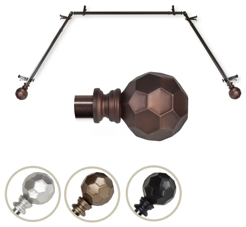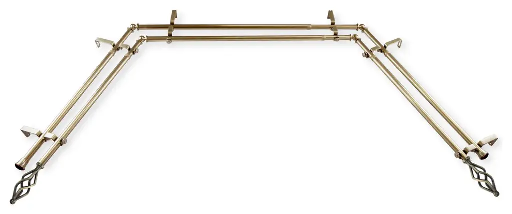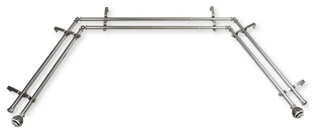 Add a sophisticated touch to your bay window treatment with a 13/16" diameter bay window curtain rod set. Made of high quality steel rods and resin finials. Includes one center rod 38-72 inches; two side rod 20-36 inches each; 6 brackets; 2 finials.Projection: 2.875"Finial measurement: 3" W x 2.25" H x 2.25" DRod Diameter: 13/16 inch
