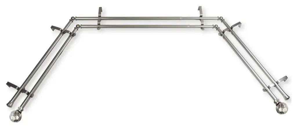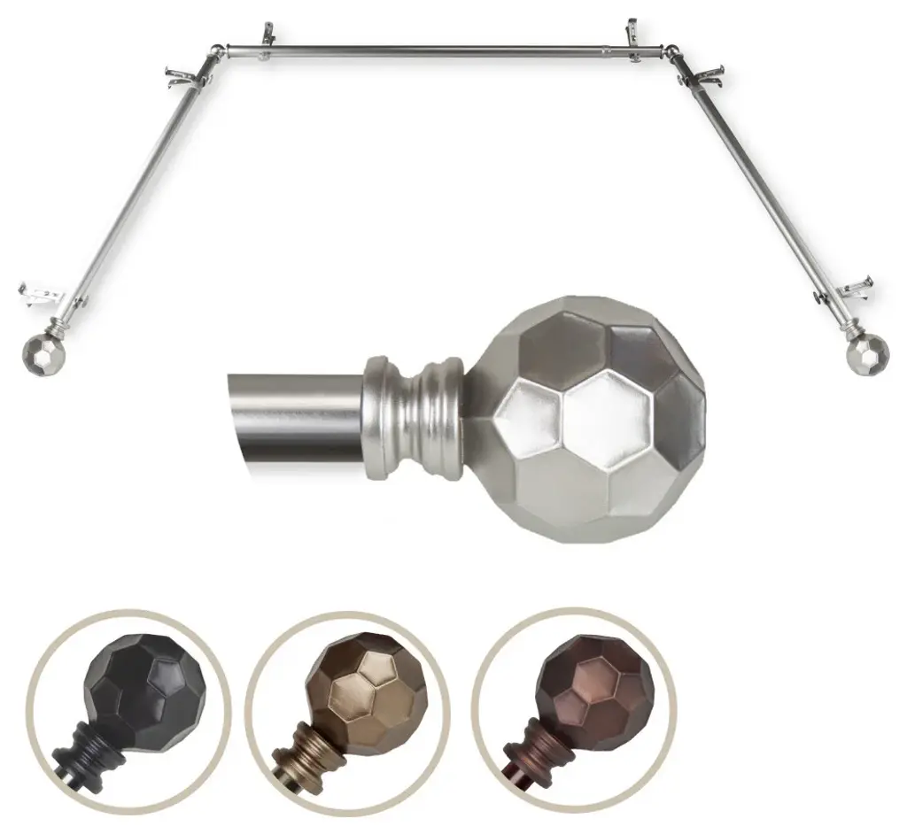 Add a sophisticated touch to your bay window treatment with a 13/16" diameter bay window curtain rod set. Made of high quality steel rods and resin finials. Includes one center rod 38-72 inches; two side rod 20-36 inches each; 6 brackets; 2 finials.Projection: 2.875"Finial measurement: 3" W x 2.25" H x 2.25" DRod Diameter: 13/16 inch