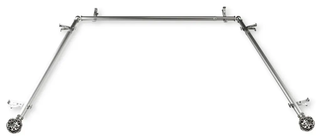 Add a sophisticated touch to your bay window treatment with a 13/16" diameter bay window curtain rod set. Made of high quality steel rods and resin finials. Includes two center rod 38-72 inches; four side rod 20-36 inches each; 6 brackets; 2 finials.Projection: front rod to wall 6.375"; back rod to wall 3.75"Finial measurement: 3" W x 2.25" H x 2.25" DRod Diameter: 13/16 inch