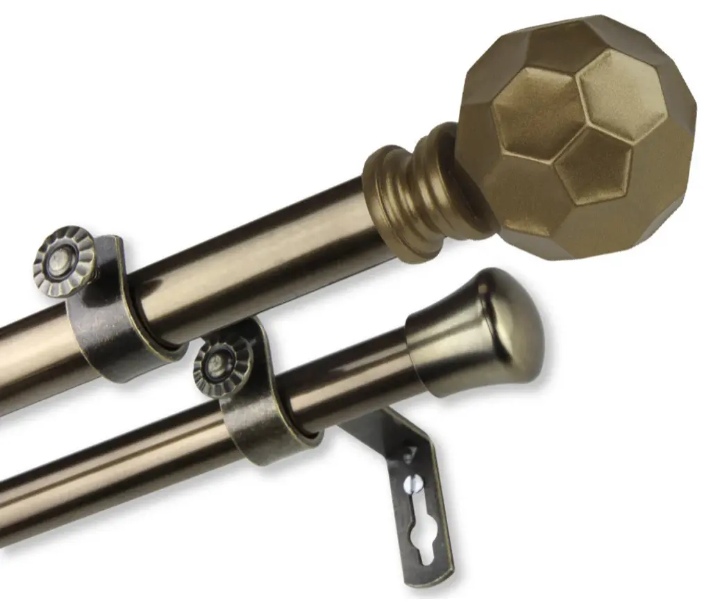 Add a sophisticated touch to your window treatment with a 13/16" diameter double curtain rod set. Made of high quality steel rods and resin finials. Includes two 120-170 inches telescoping steel pole 4 brackets and 2 finialsProjection: front rod to wall 6.375"; back rod to wall 3.75"Finial measurement: 3" W x 2.25" H x 2.25" DRod Diameter: 13/16 inch
