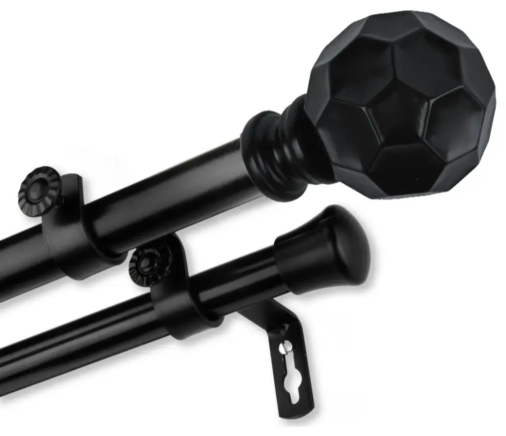 Add a sophisticated touch to your window treatment with a 13/16" diameter double curtain rod set. Made of high quality steel rods and resin finials. Includes two 66-120 inches telescoping steel pole 3 brackets and 2 finialsProjection: front rod to wall 6.375"; back rod to wall 3.75"Finial measurement: 3" W x 2.25" H x 2.25" DRod Diameter: 13/16 inch