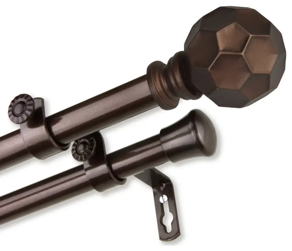 Add a sophisticated touch to your window treatment with a 13/16" diameter double curtain rod set. Made of high quality steel rods and resin finials. Includes two 28-48 inches telescoping steel pole 2 brackets and 2 finials.Projection: front rod to wall 6.375"; back rod to wall 3.75"Finial measurement: 3" W x 2.25" H x 2.25" DRod Diameter: 13/16 inch