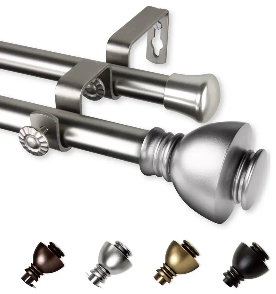 Includes Double Rod, 2 Finials, and Mounting Hardware. Front Rod Projection: 6.75" Back Rod Projection: 3.75" Steel Rod and Plastic Finials. Finial Measures: 0.75" x 1.5" x 1.5"