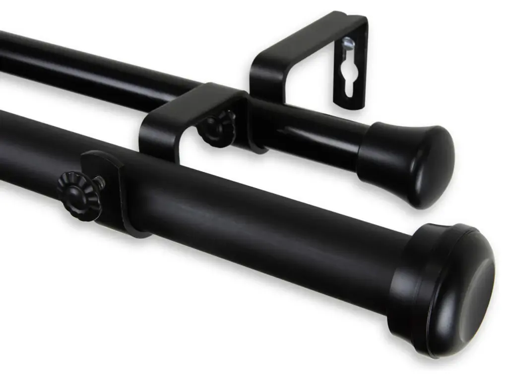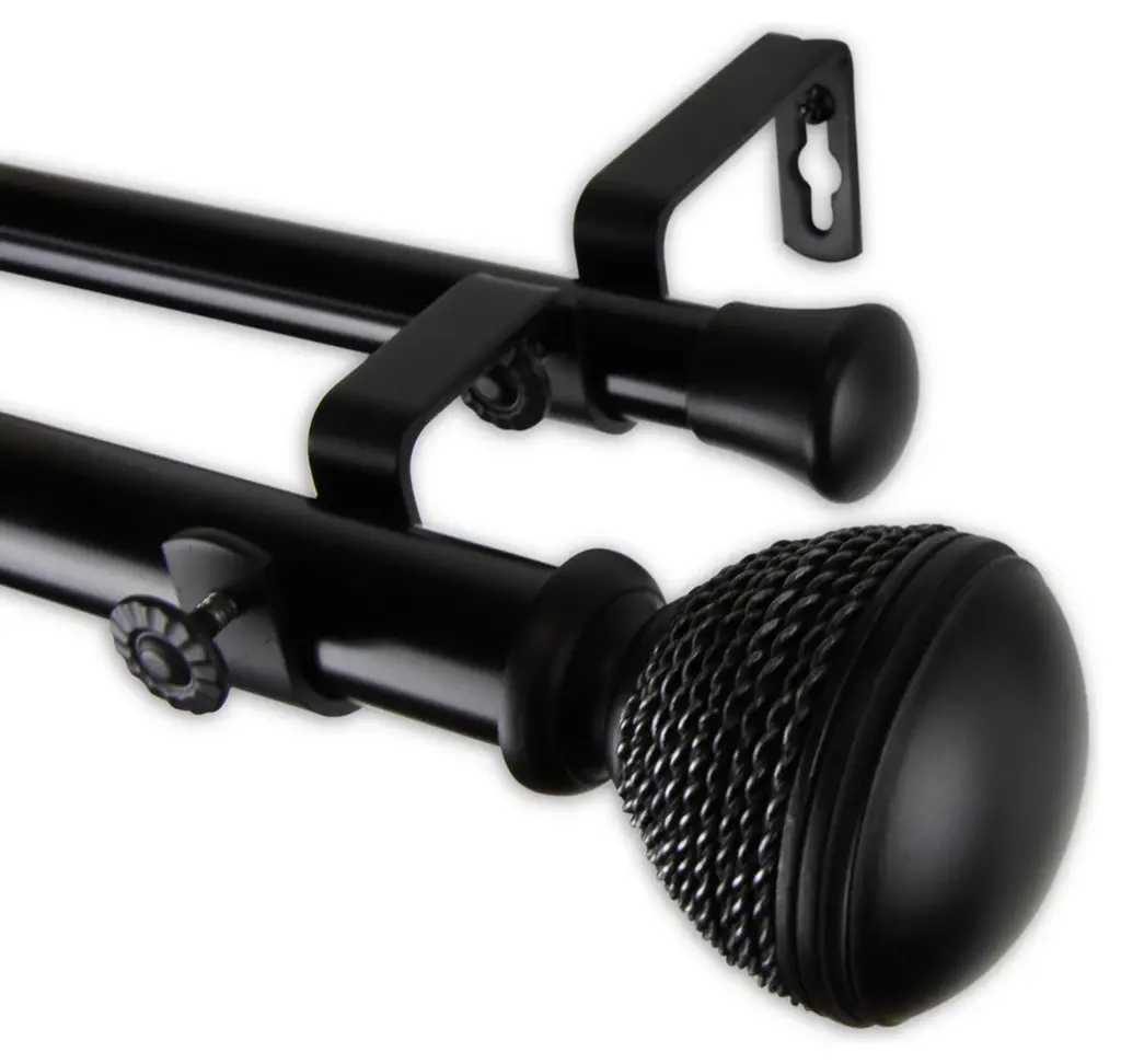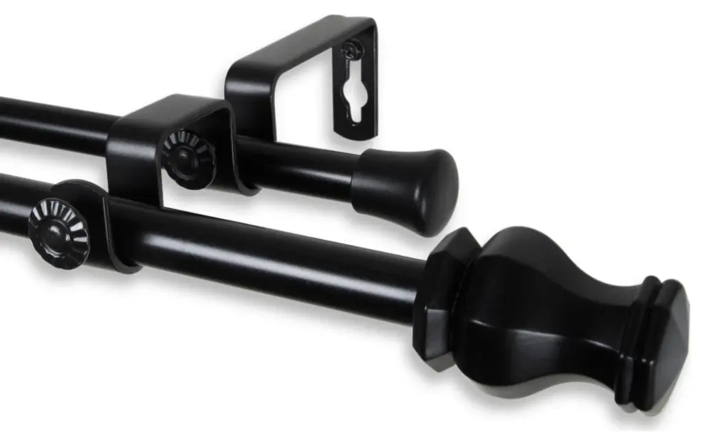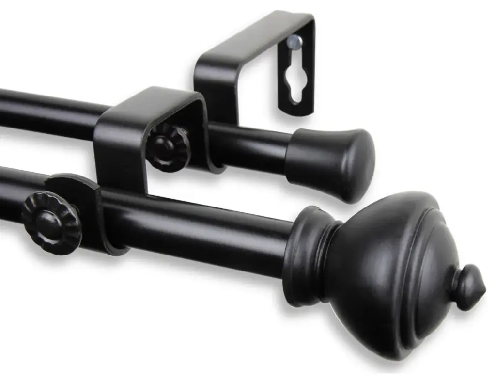 Includes Double Rod, 2 Finials, and Mounting Hardware. Front Rod Projection: 6.75" Back Rod Projection: 3.75" Steel Rod and Plastic Finials. Finial Measures: 0.75" x 1.5" x 1.5"