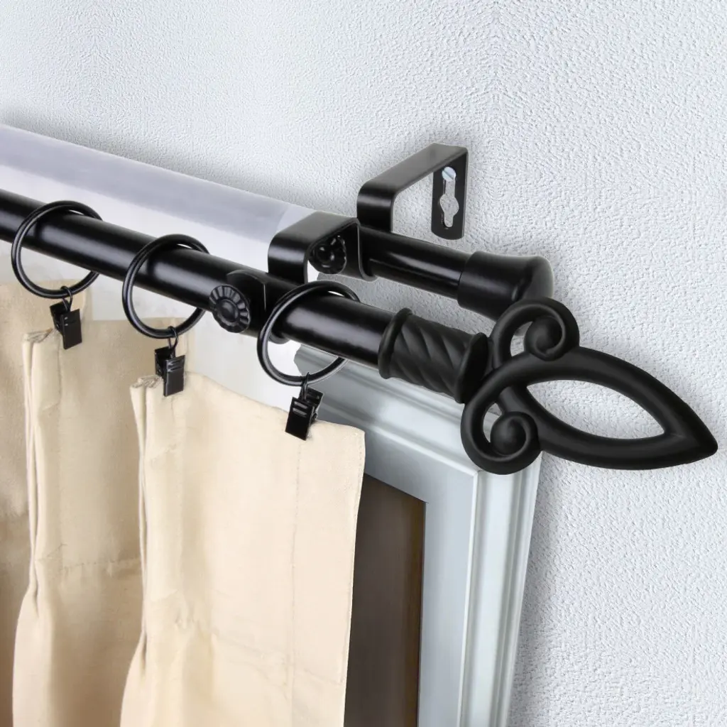 Introduce an elegant touch to your window treatment with this beautiful 13/16" diameter double curtain rod set, made of high quality steel rods. Includes 2 telescoping steel pole, mounting hardware, brackets, and 2 finials Projection: 2.875" Finial measurement: 4.625" W x 2.5" H x .25" D