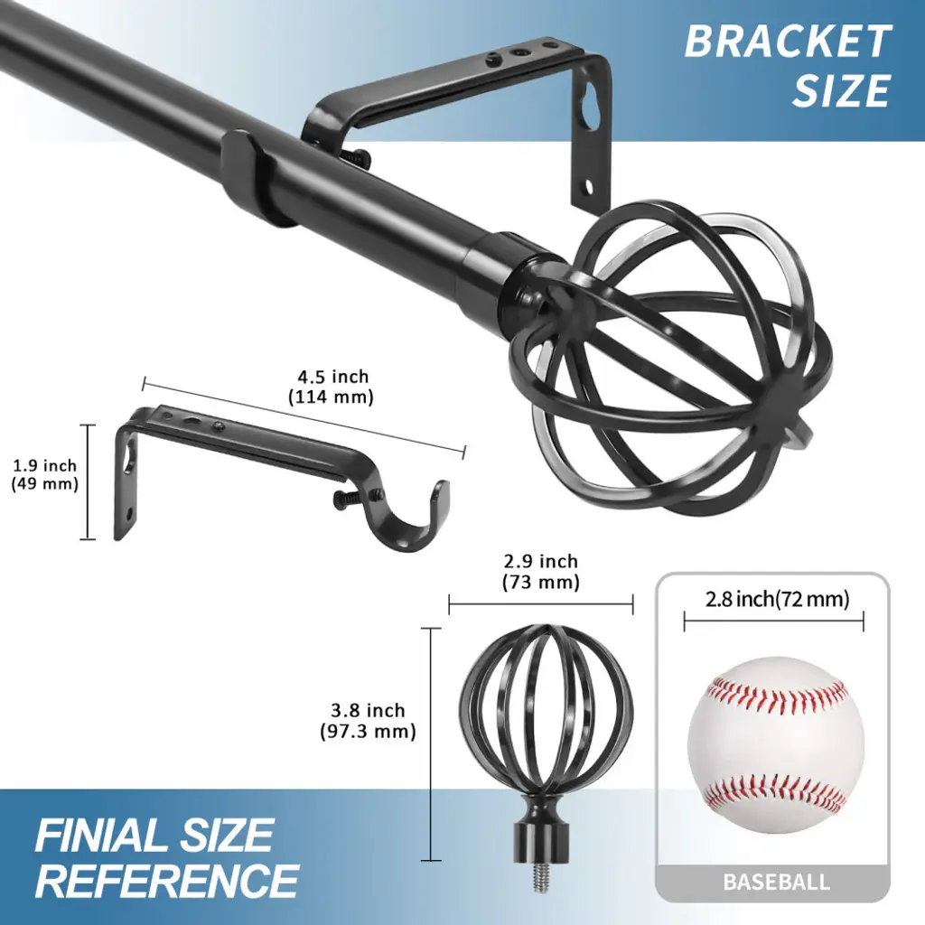 Bring a designer''s touch to your window treatments with the Steel Cage Ball Rod SetSteel adjustable rod, Outer rod measures 3/4" dia., inner rod measures 5/8" dia.Mounting hardware included:? standard matching brackets that extend from 4" to 5.13" deep.?Finial size: 2 3/4 inches diameterAssembly required. A screwdriver is needed to install