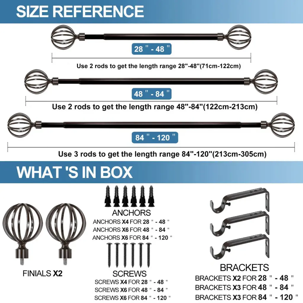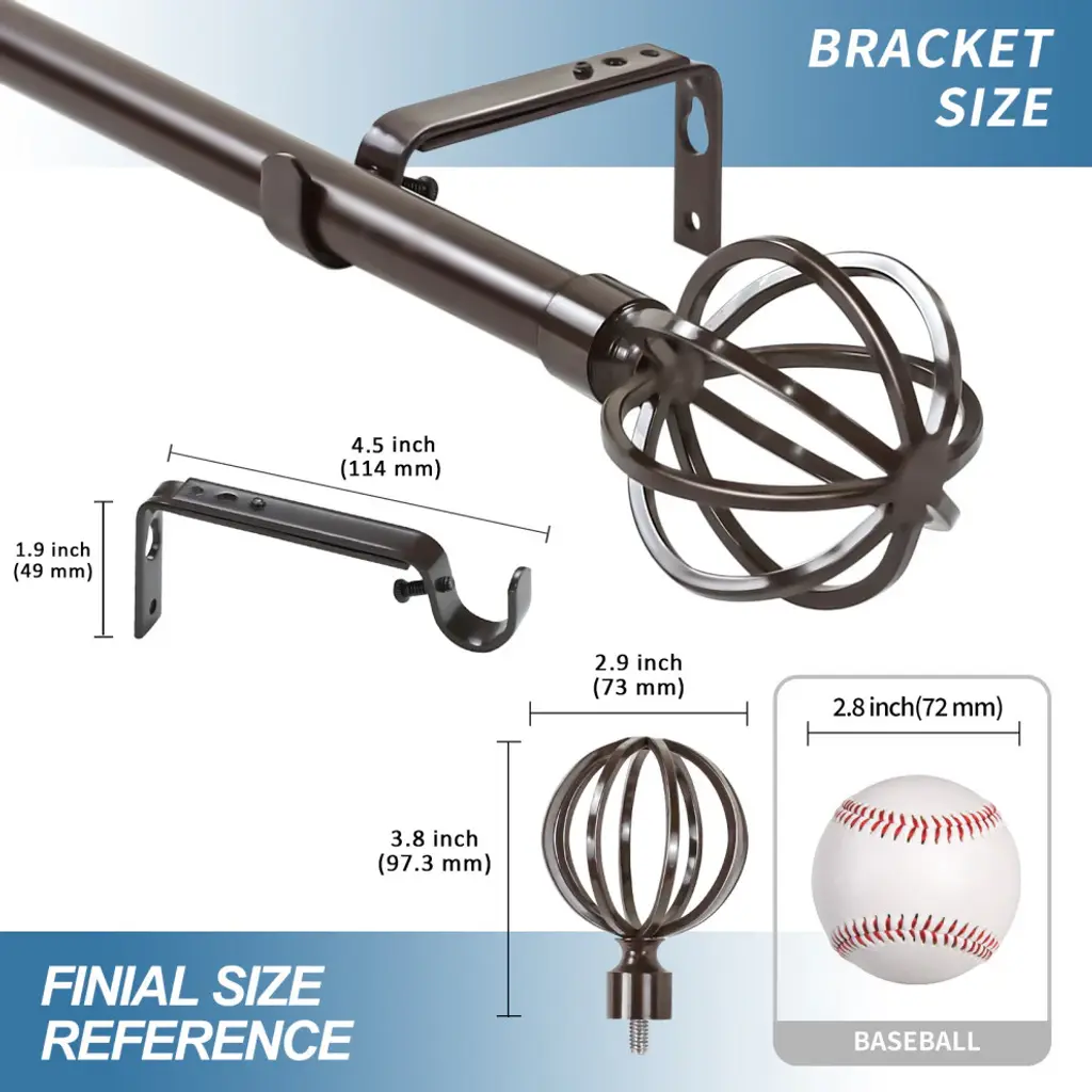 Bring a designer''s touch to your window treatments with the Steel Cage Ball Rod SetSteel adjustable rod, Outer rod measures 3/4" dia., inner rod measures 5/8" dia.Mounting hardware included:? standard matching brackets that extend from 4" to 5.16" deep.?Finial size: 2 3/4 inches diameterAssembly required. A screwdriver is needed to install
