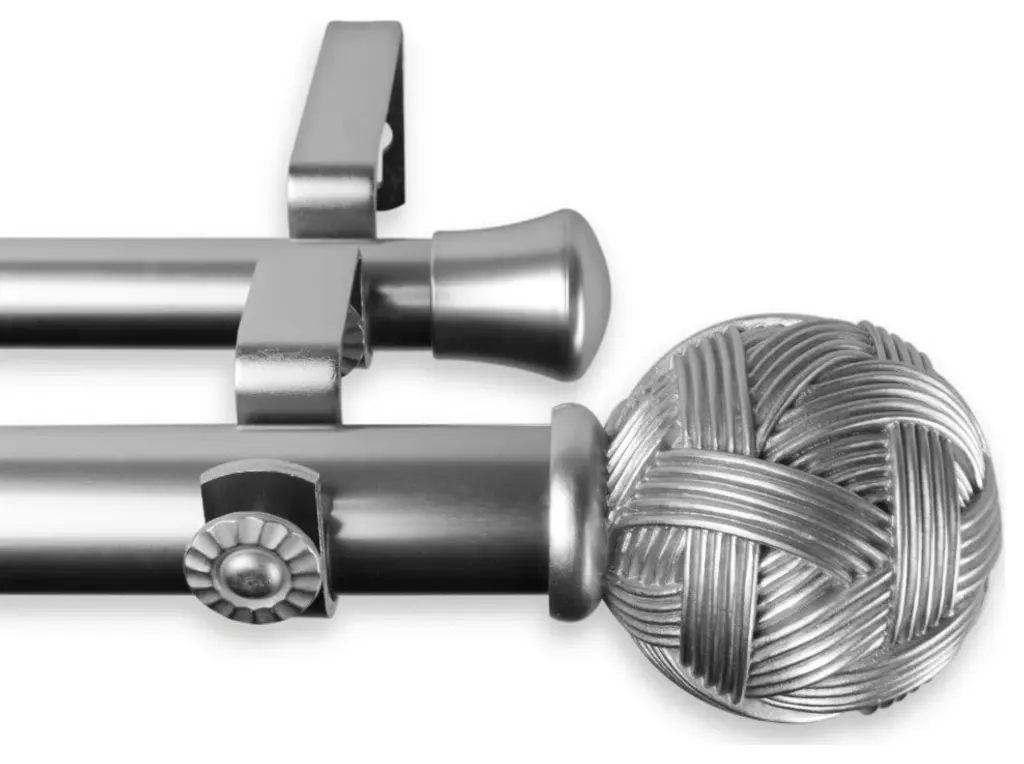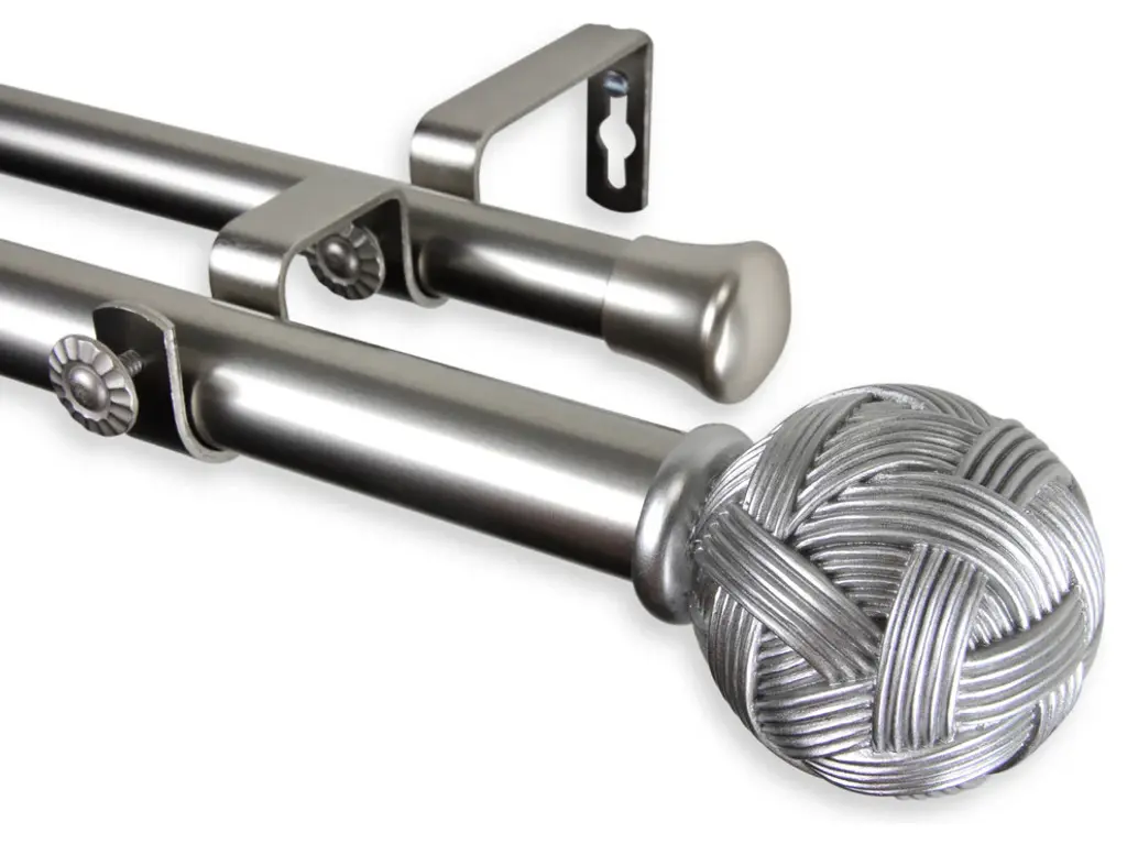 Includes Double Rod, 2 Finials, and Mounting Hardware. Front Rod Projection: 6.75" Back Rod Projection: 3.75" Steel Rod and Resin Finials. Finial Measures: 2.5" x 2.25" x 2.25"