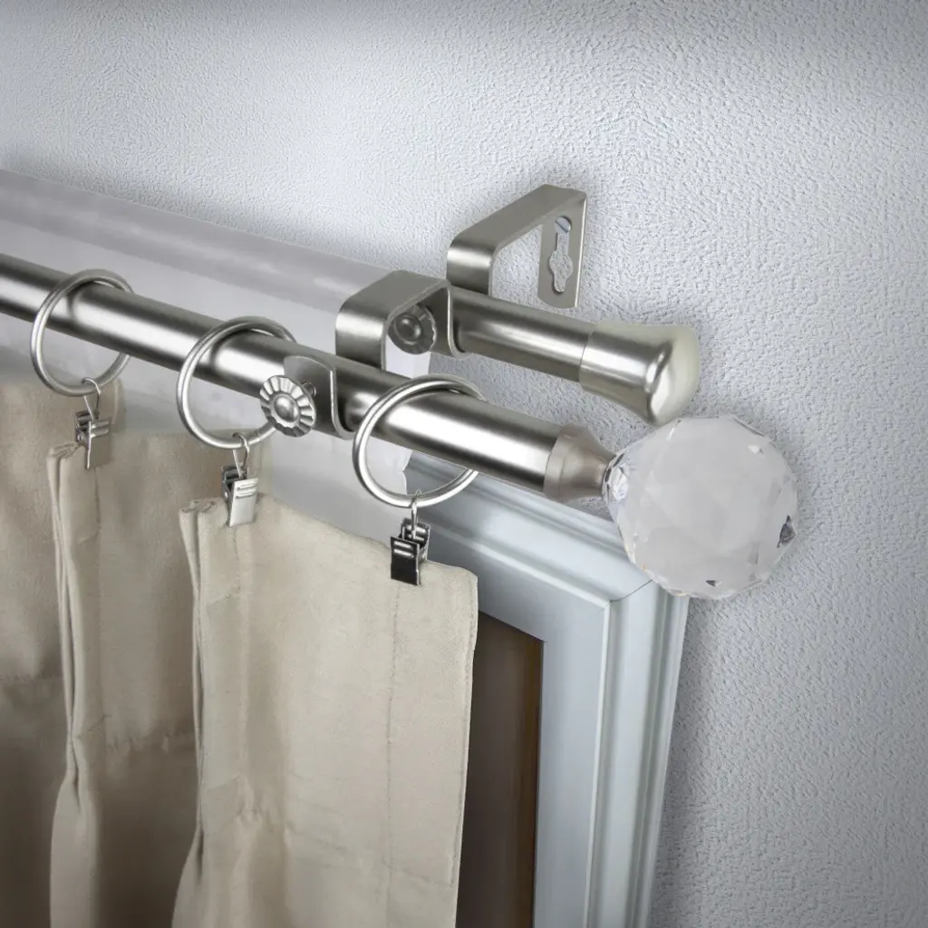 Introduce an elegant touch to your window treatment with this beautiful 13/16" diameter double curtain rod set, made of high quality steel rods. Includes 2 telescoping steel pole, mounting hardware, brackets, and 2 finials Projection: 2.875" Finial measurement: 3" W x 2.25" H x 2.25" D