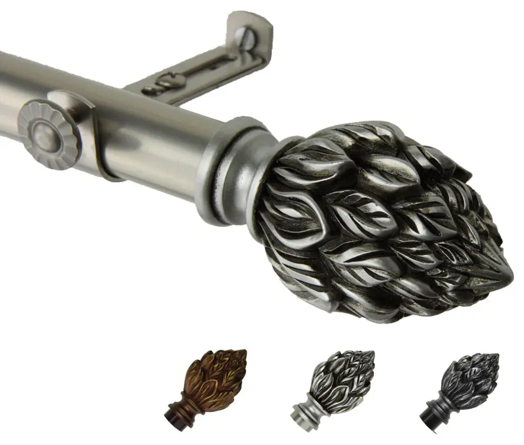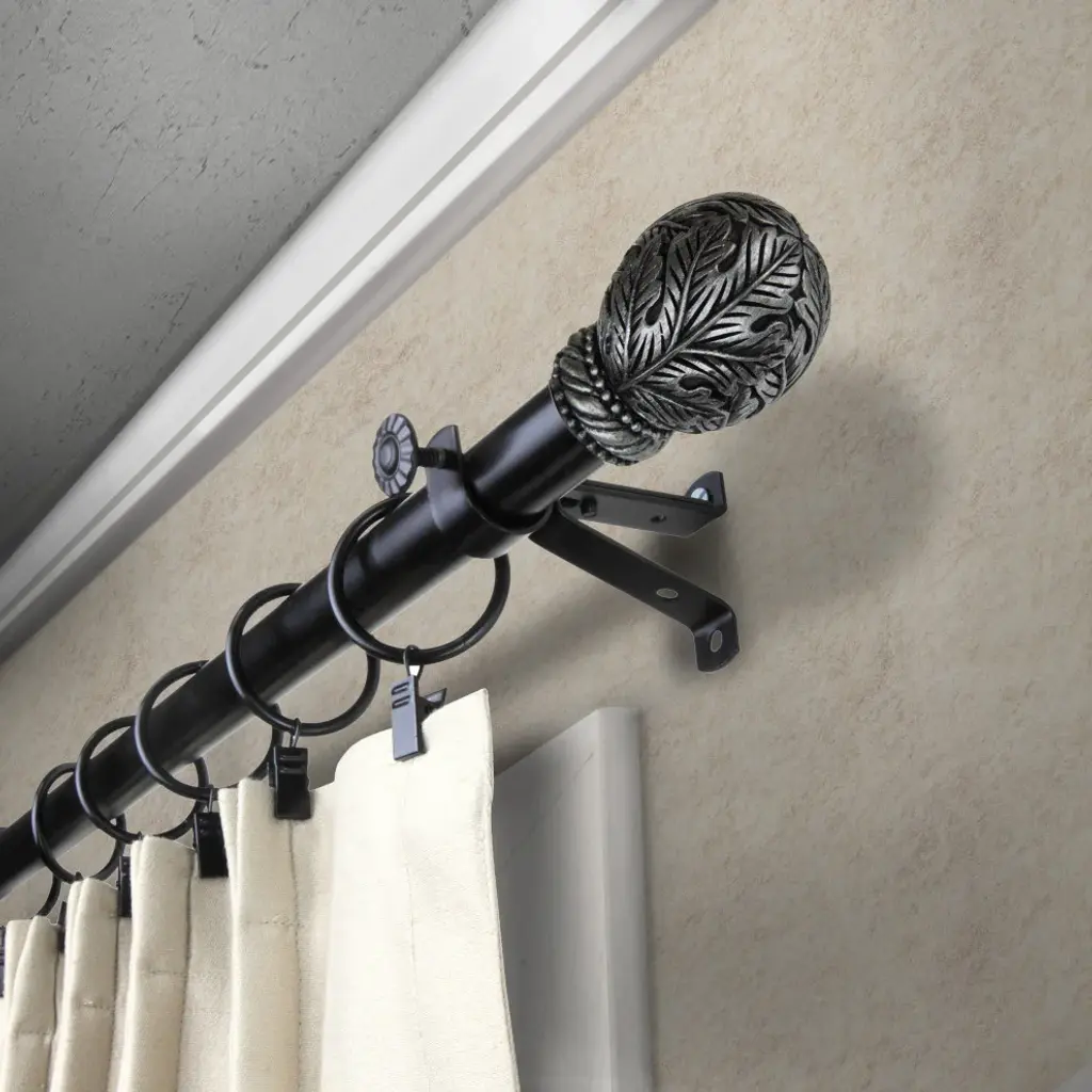 Introduce an elegant touch to your window treatment with this beautiful 13/16" diameter curtain rod set, made of high quality steel rods. Includes telescoping steel pole, mounting hardware, brackets, and 2 finials Projection: 2.875" Finial measurement: 2.5" W x 1.7" H x 1.7" D
