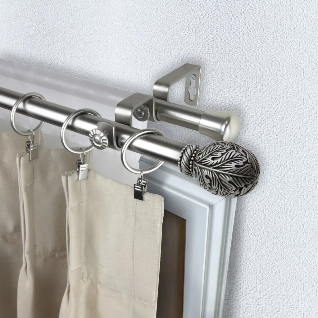 Introduce an elegant touch to your window treatment with this beautiful 13/16" diameter double curtain rod set, made of high quality steel rods. Includes 2 telescoping steel pole, mounting hardware, brackets, and 2 finials Projection: 2.875" Finial measurement: 2.5" W x 1.7" H x 1.7" D