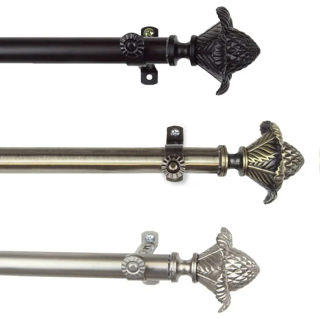 Introduce an elegant touch to your window treatment with this beautiful 13/16" diameter curtain rod set, made of high quality steel rods. Includes telescoping steel pole, mounting hardware, brackets, and 2 finials Projection: 2.875" Finial measurement: 2.625" W x 2.75" H x 2.75" D