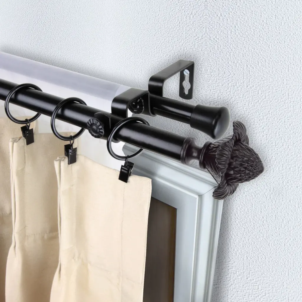 Introduce an elegant touch to your window treatment with this beautiful 13/16" diameter double curtain rod set, made of high quality steel rods. Includes 2 telescoping steel pole, mounting hardware, brackets, and 2 finials Projection: 2.875" Finial measurement: 2.625" W x 2.75" H x 2.75" D
