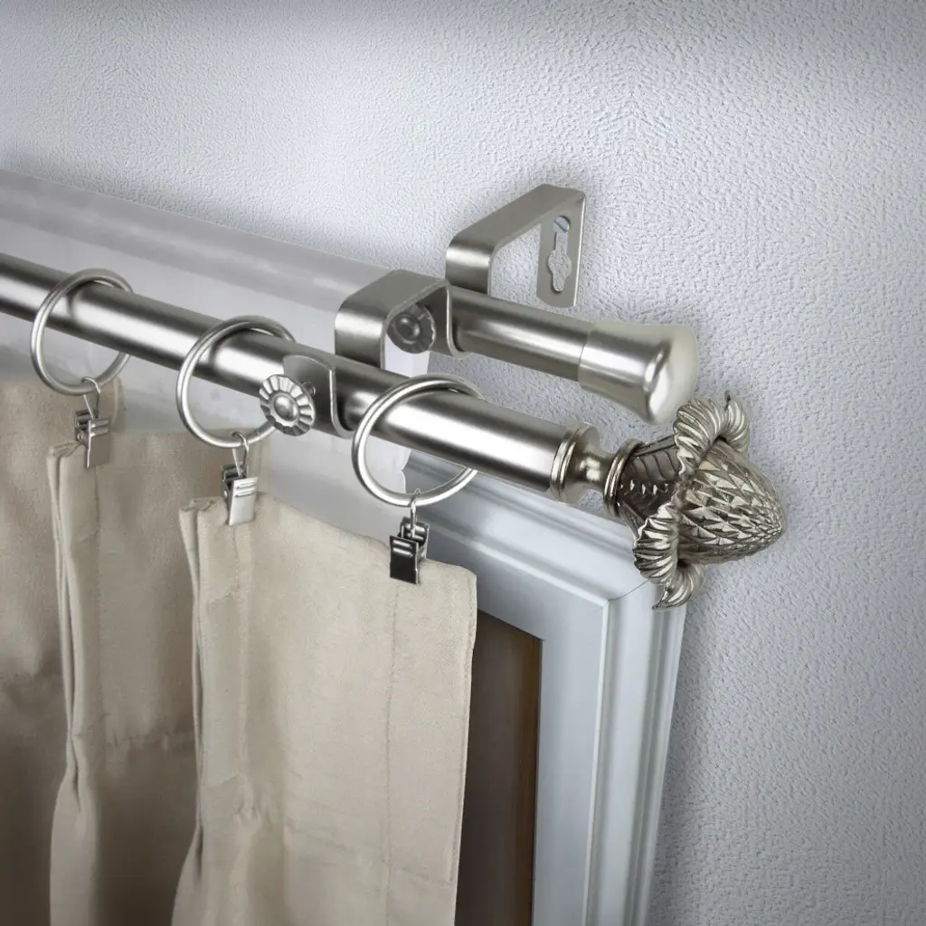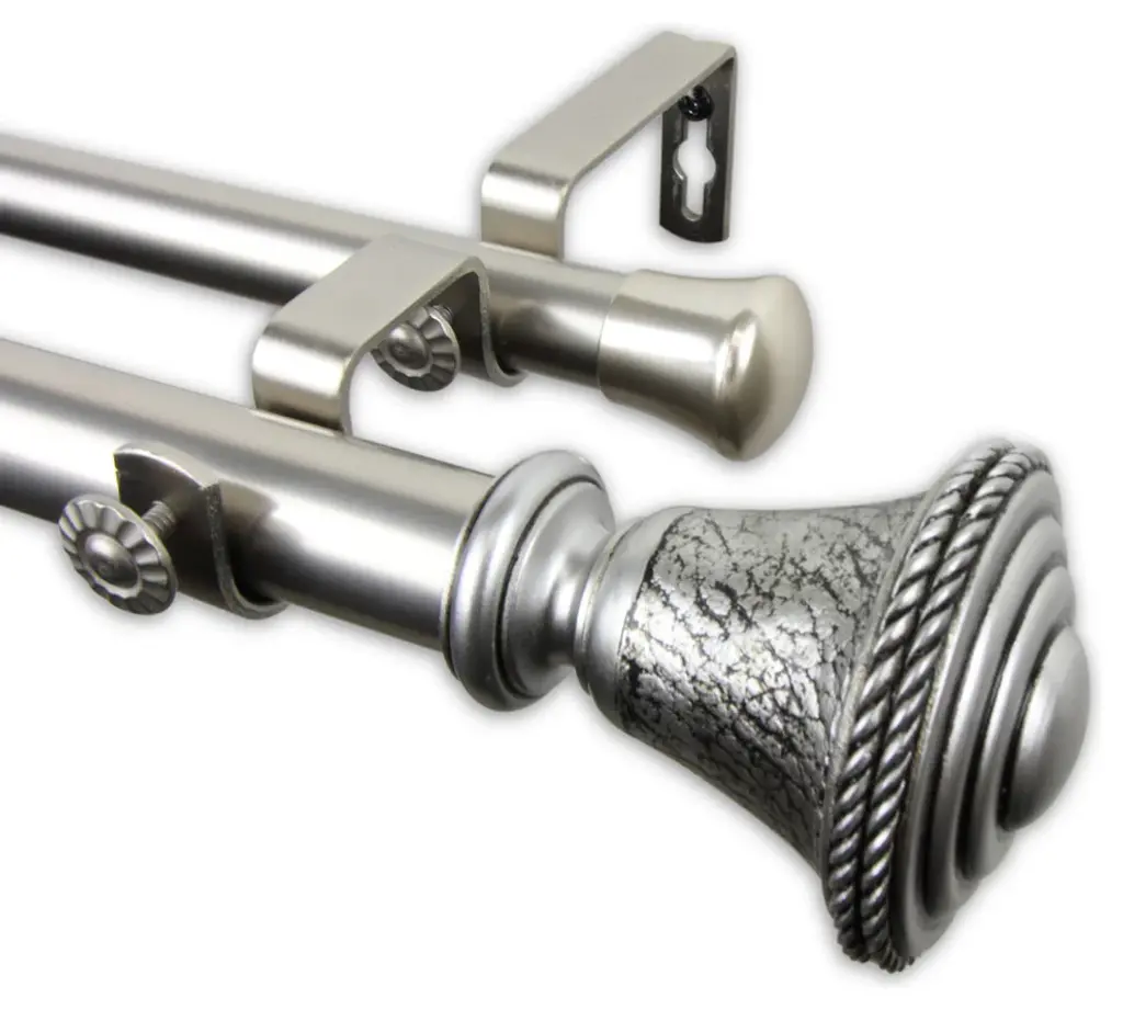 Introduce an elegant touch to your window treatment with this beautiful 13/16" diameter double curtain rod set, made of high quality steel rods. Includes 2 telescoping steel pole, mounting hardware, brackets, and 2 finials Projection: 2.875" Finial measurement: 2.625" W x 2.75" H x 2.75" D