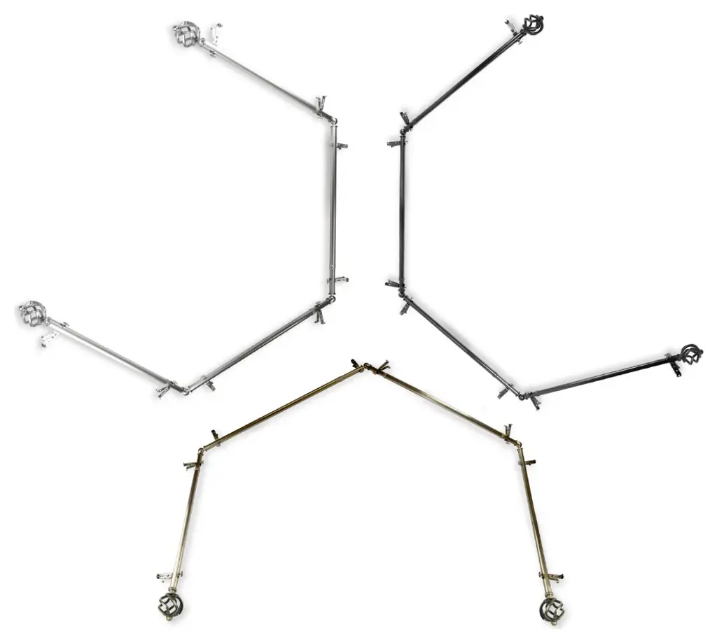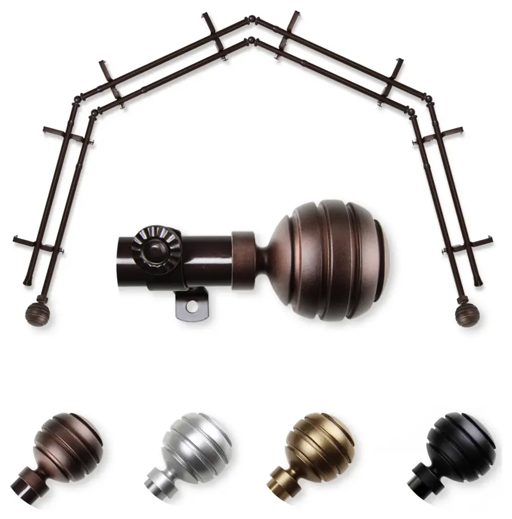 Central Design Products presents the perfect enhancement to your window treatment with high-end quality 4-Sided Double Bay Curtain Rods, Walter edition. Effortlessly style your 4 sided window treatment with these Bay Curtain Rods. Designed to add a modern touch for those tricky bay windows. Includes 8 curtain rods of 13/16" diameter, 8 support brackets, 6 corner connectors, and mounting hardware. Projection: 6.375" Clearance: 3.75" Rod Diameter: 13/16" Material: Steel Color: Cocoa