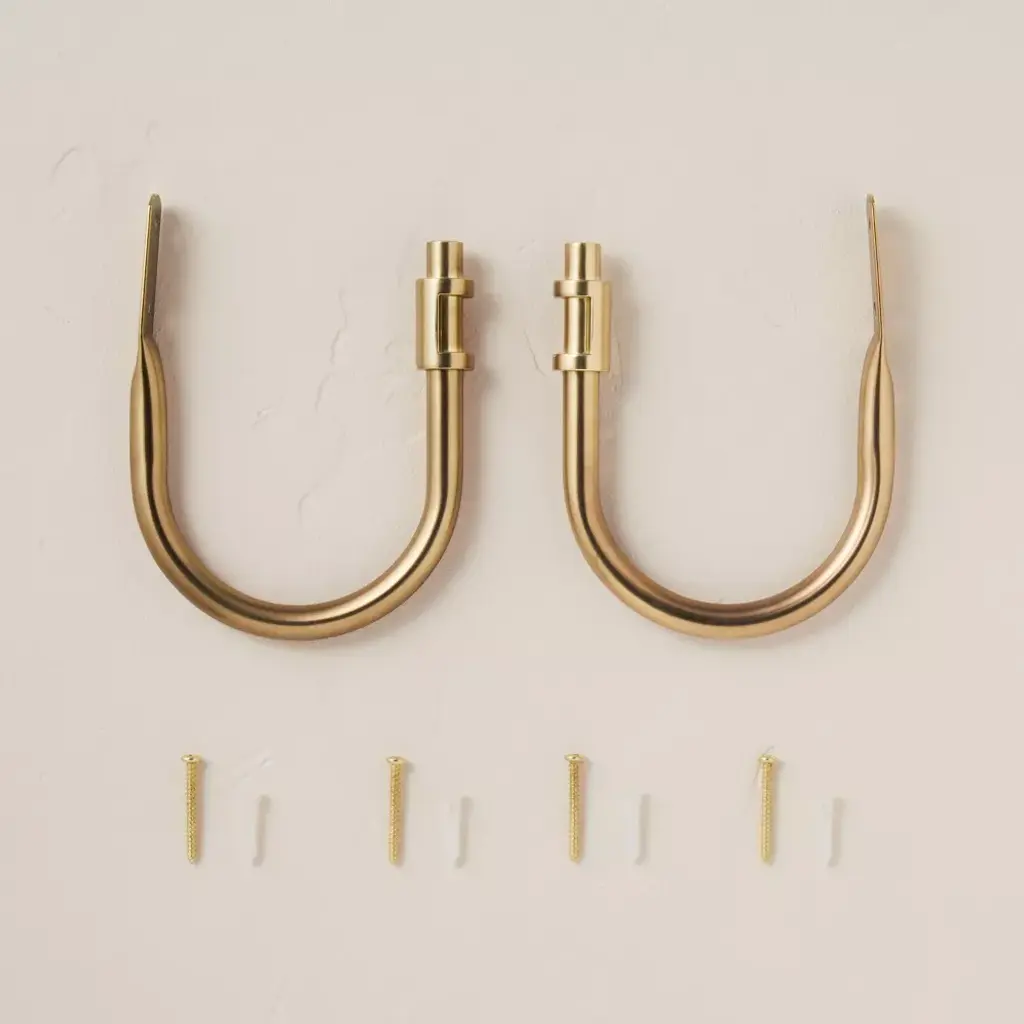 Keep your curtains drawn back in glam style with the 2-Count Antiqued-Finish Curtain Holdback Set from Hearth & Hand™ with Magnolia. Made with tarnish-resistant metal in an antiqued finish, this pair of decorative hooks features a sleek J-hook design that easily attaches to the sides of the window to hold curtain panels open. All necessary hardware is included for easy installation — just mount and use! Designed to enhance any window treatment with a special touch of sparkle, the metal holdbacks easily tuck your drapery behind, giving your windows a designer look while welcoming light in. Celebrate the everyday with Hearth & Hand — created exclusively for Target in collaboration with Magnolia, a home and lifestyle brand by Chip & Joanna Gaines. Built upon our shared commitment to giving back to our communities, these pieces reveal the beauty of everyday moments shared with family and friends.