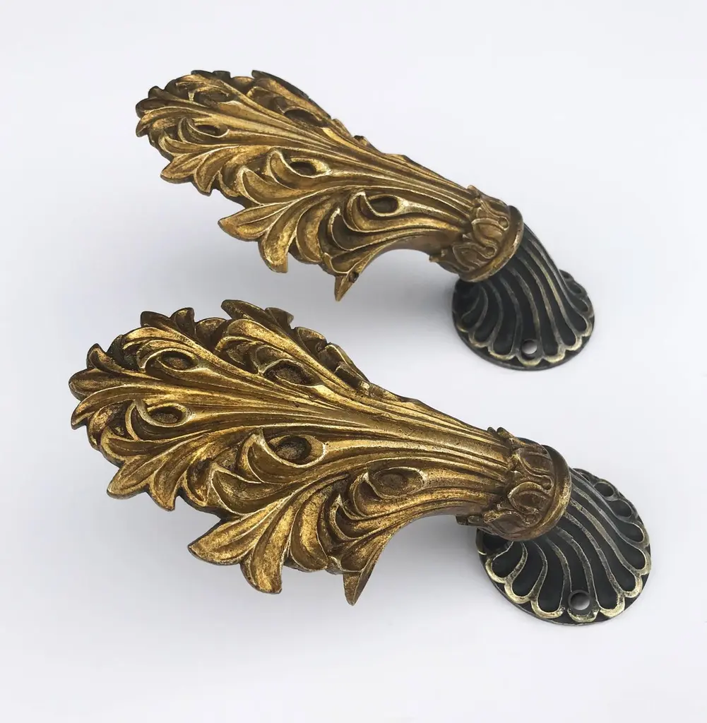 Intricate Victorian cast brass tiebacks. Can also be used as hooks.
