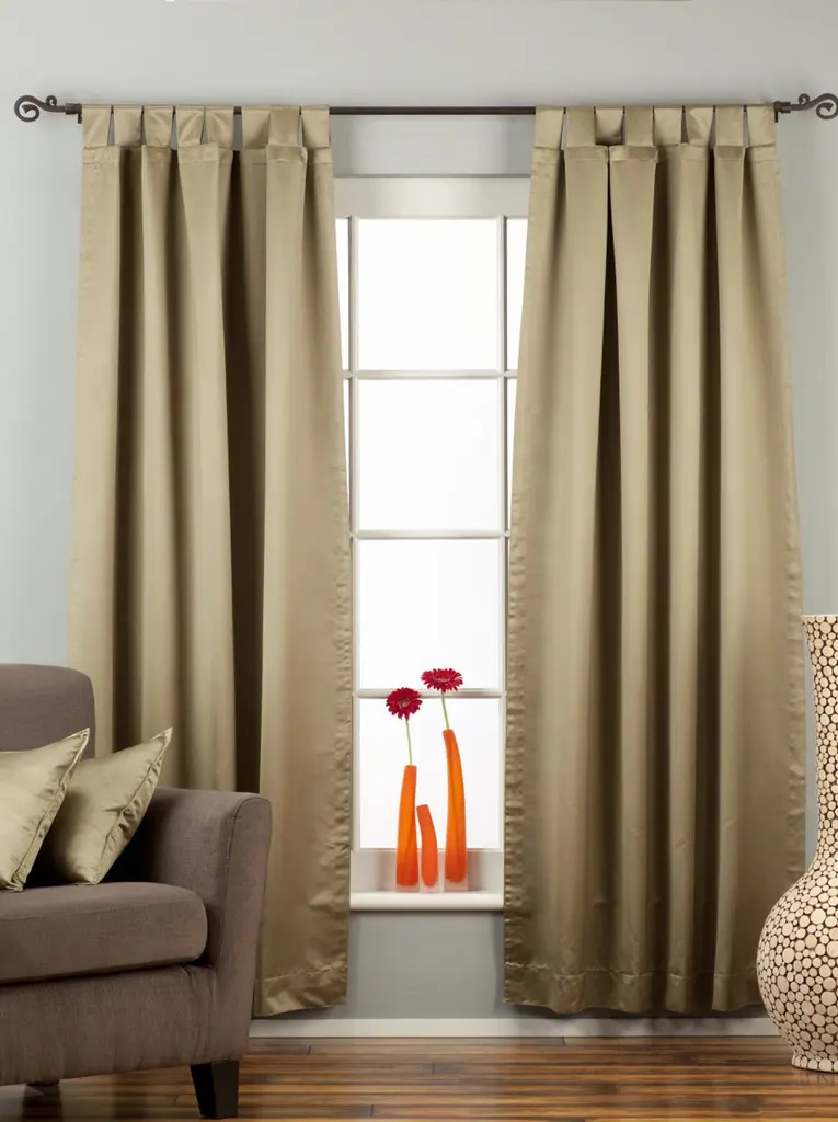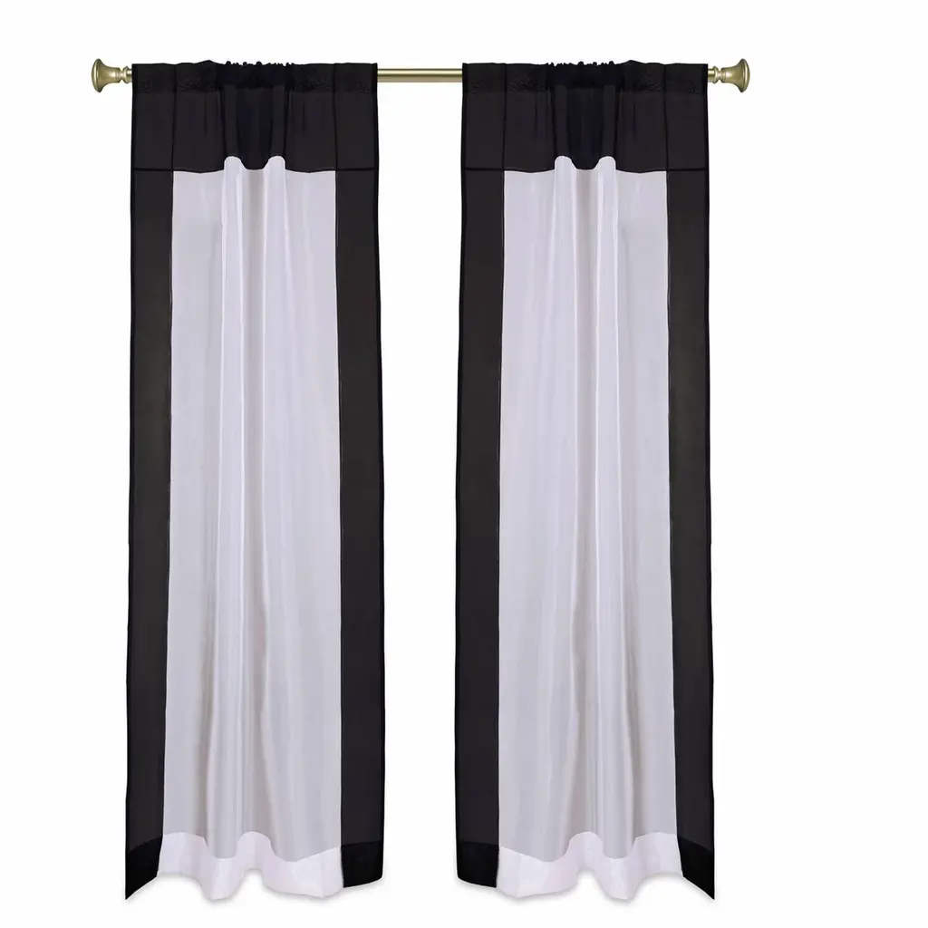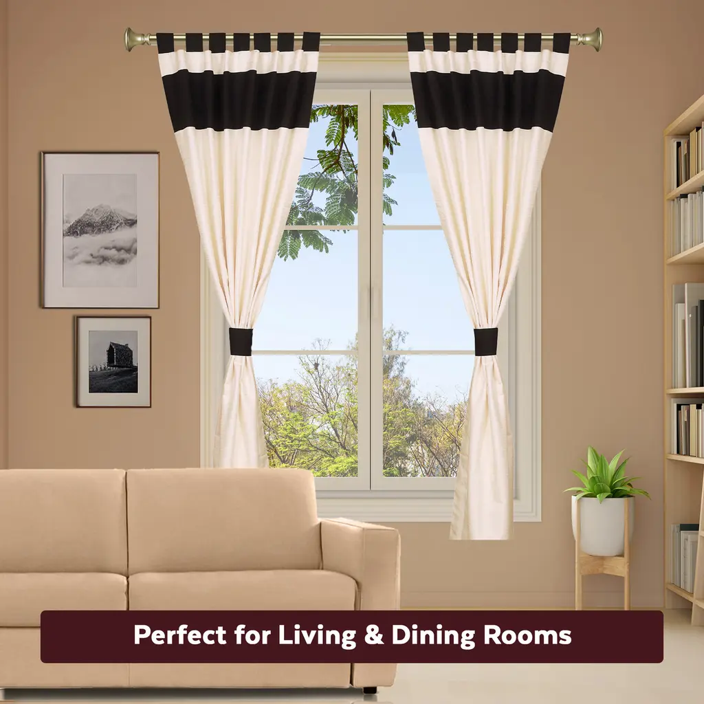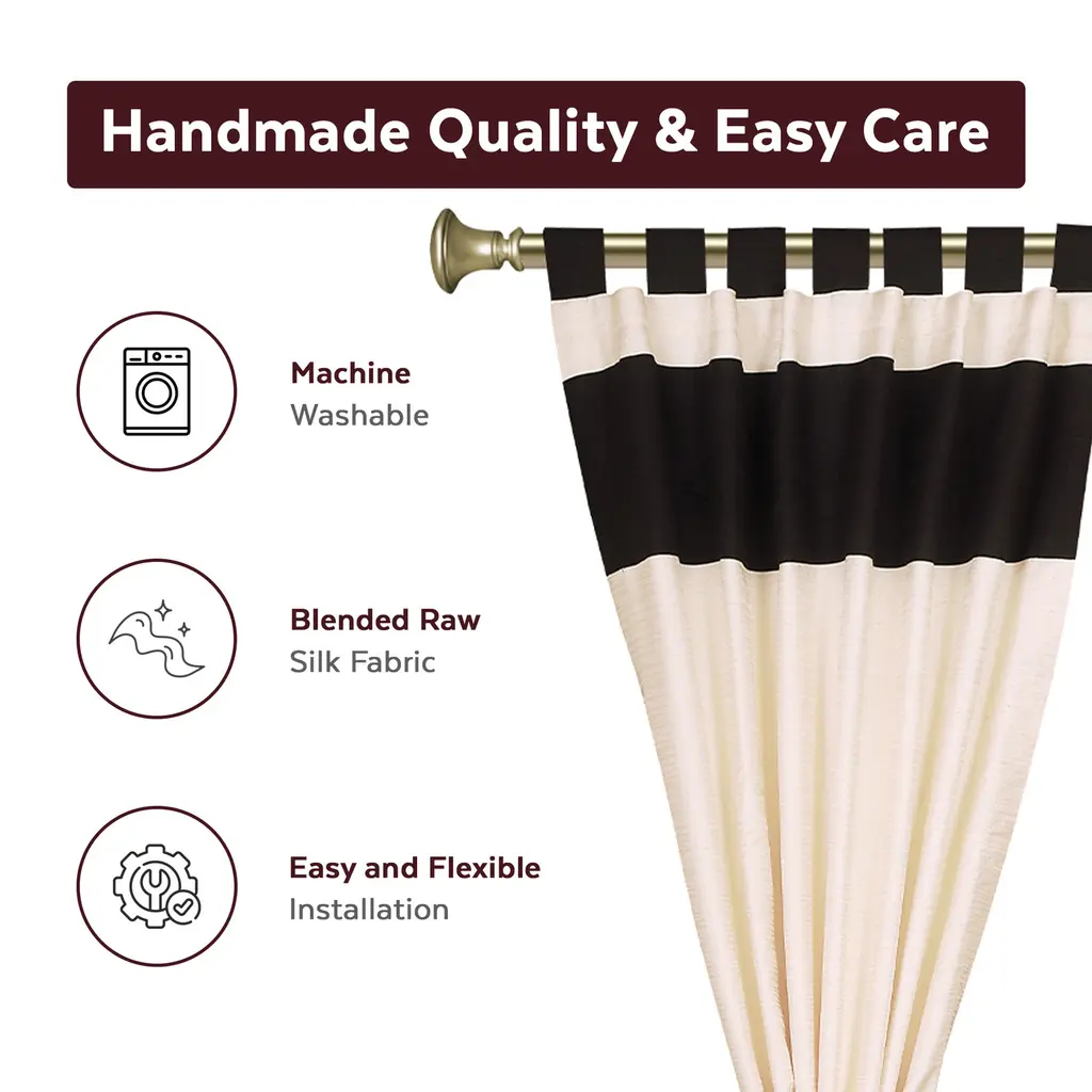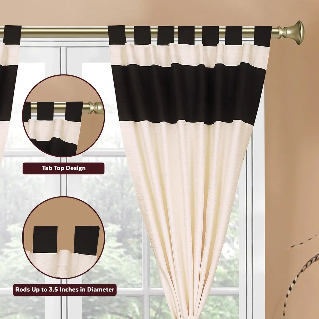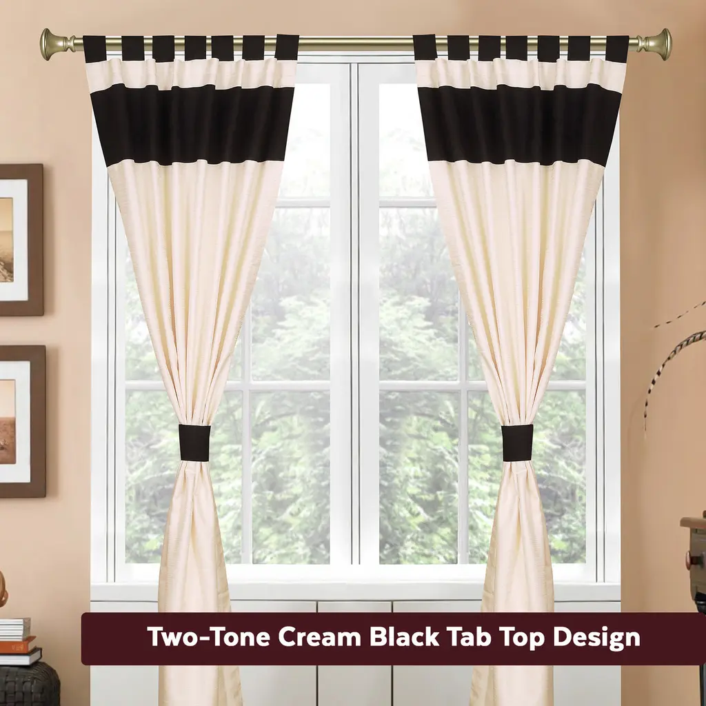 Cream Black Tab Top Raw Silk Curtain With Tieback-Pair