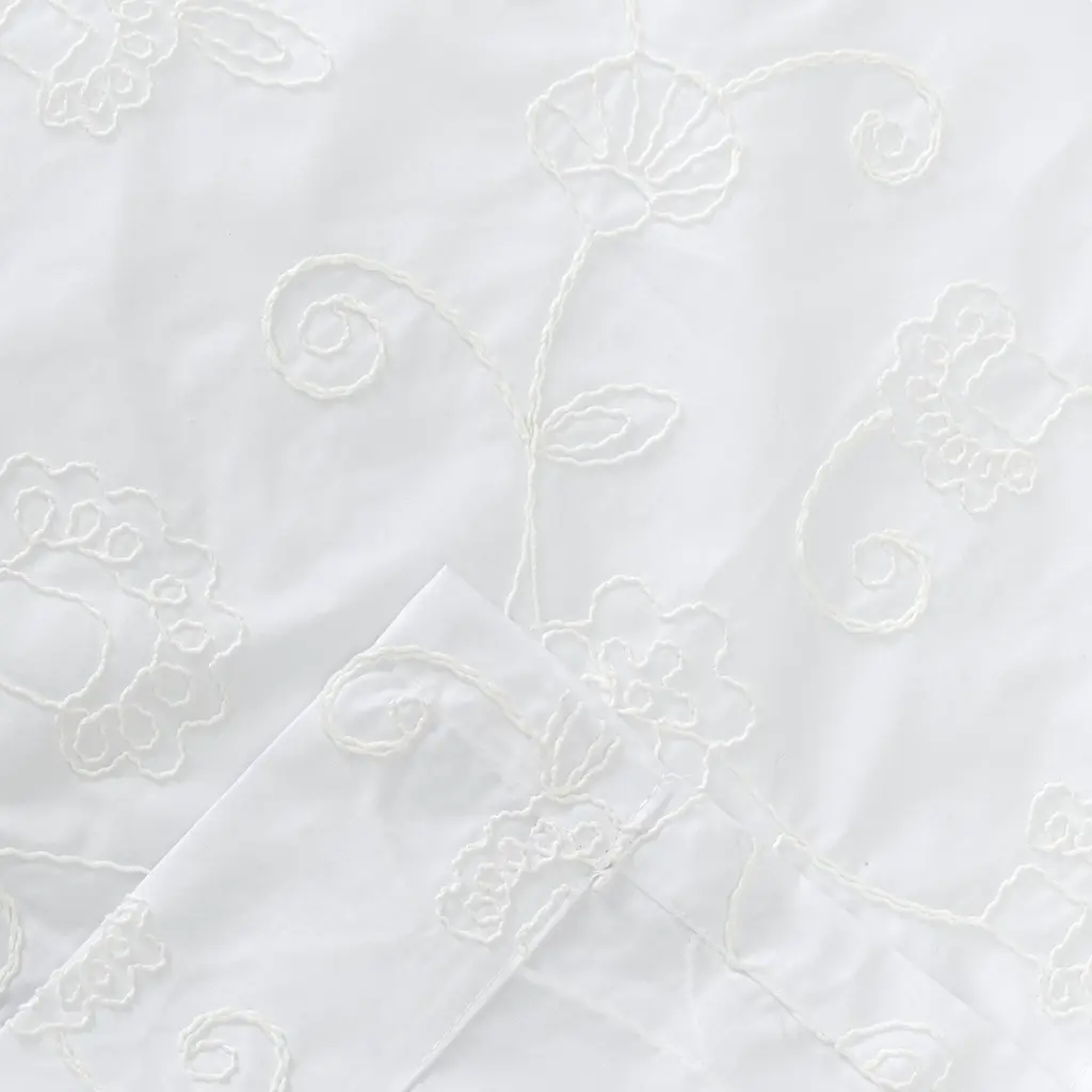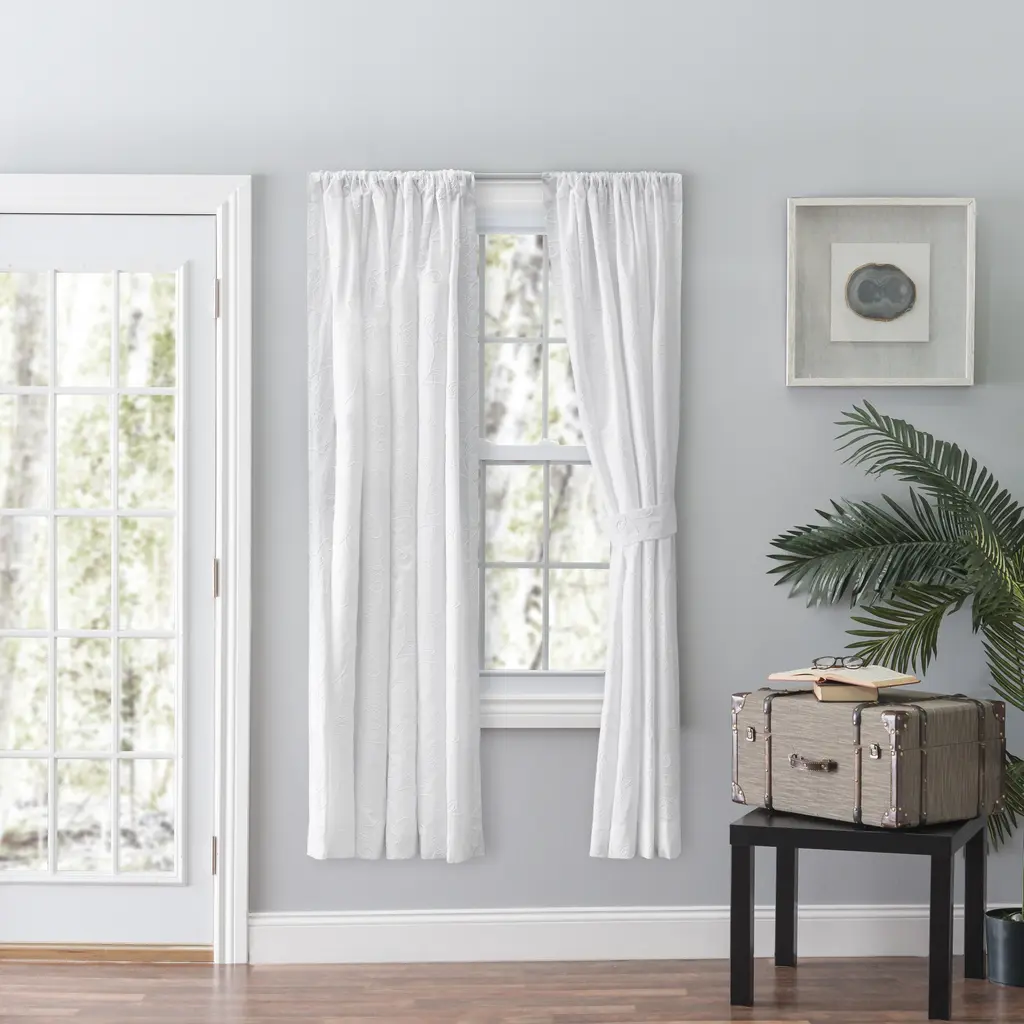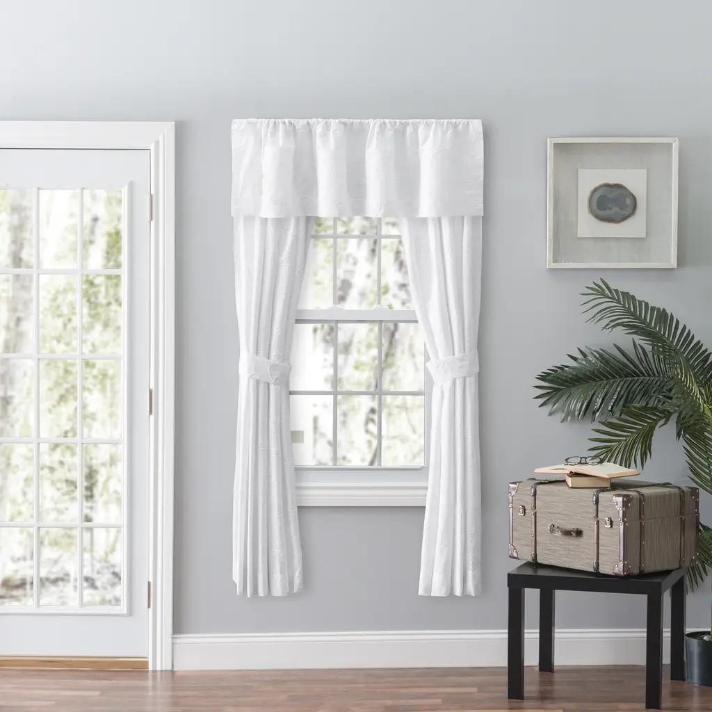 Elegant yet relaxed, embroidered candlewick stitching scrolls across this simple yet stylish window dressing. Bring a fresh, clean, light look to any room. This 3-inch rod pocket construction gives you 2-way hanging options: sewn in rod pocket for a classic look or with clip rings for an easy slide open and close (clip rings not included). Each panel measures 50 inches across and comes with a tieback so you can choose the look you want for your room: straight panel or tied back. Length measures 63-inches. A quality woven polyester/cotton blended fabric will filter light and offer privacy. To keep your curtains looking clean and crisp all year round they can be easily machine washed and tumble dried on low. Imported.