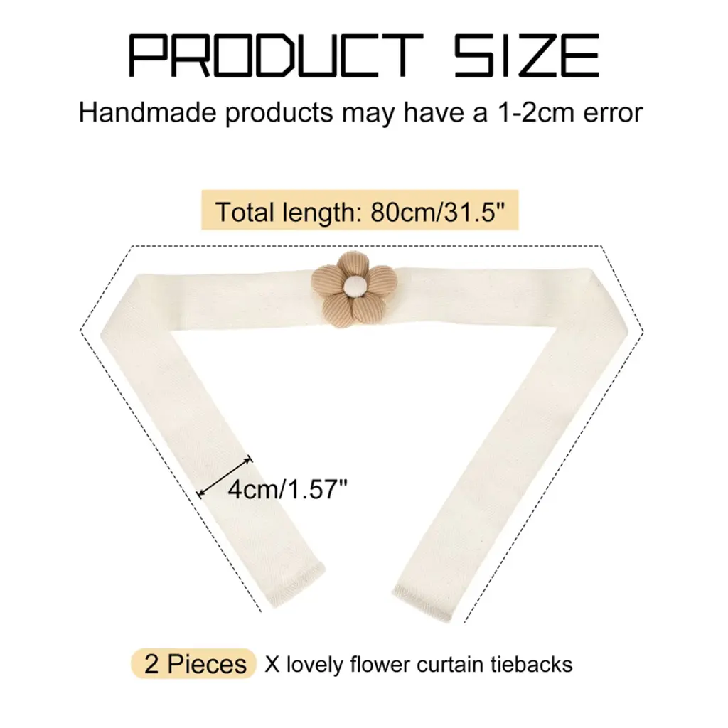 Enhance any space with these cute flower curtain tiebacks. Their compact size and elegant design allow for versatility in decoration. Made from durable cotton, these tiebacks are soft and beautifully handmade, ensuring they last longer without breaking. They are easy to use, requiring no hooks or installation, which prevents damage to walls or curtains. Ideal for various settings, including living rooms, bedrooms, and offices, these tiebacks create a warm and inviting atmosphere. Hand washable for easy upkeep, they are perfect for both everyday and special occasions.