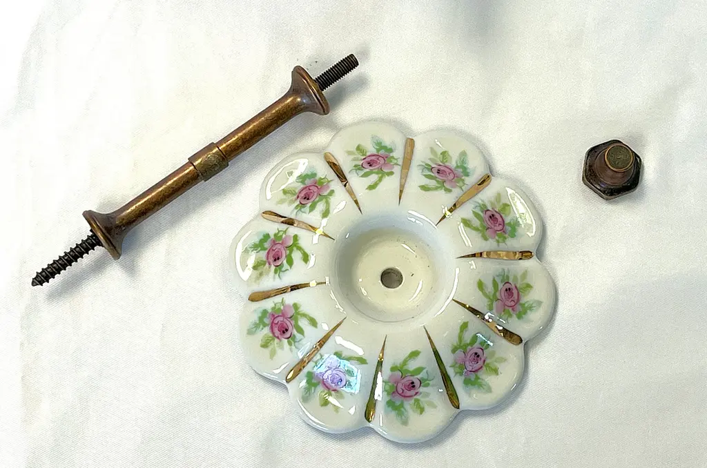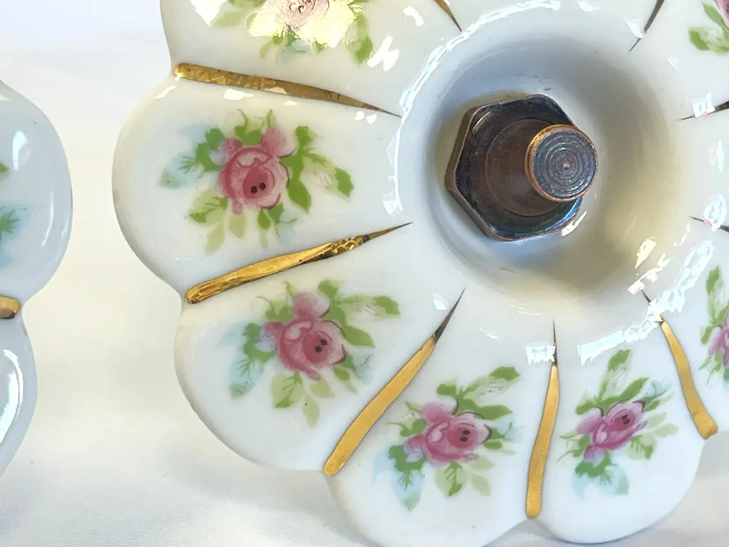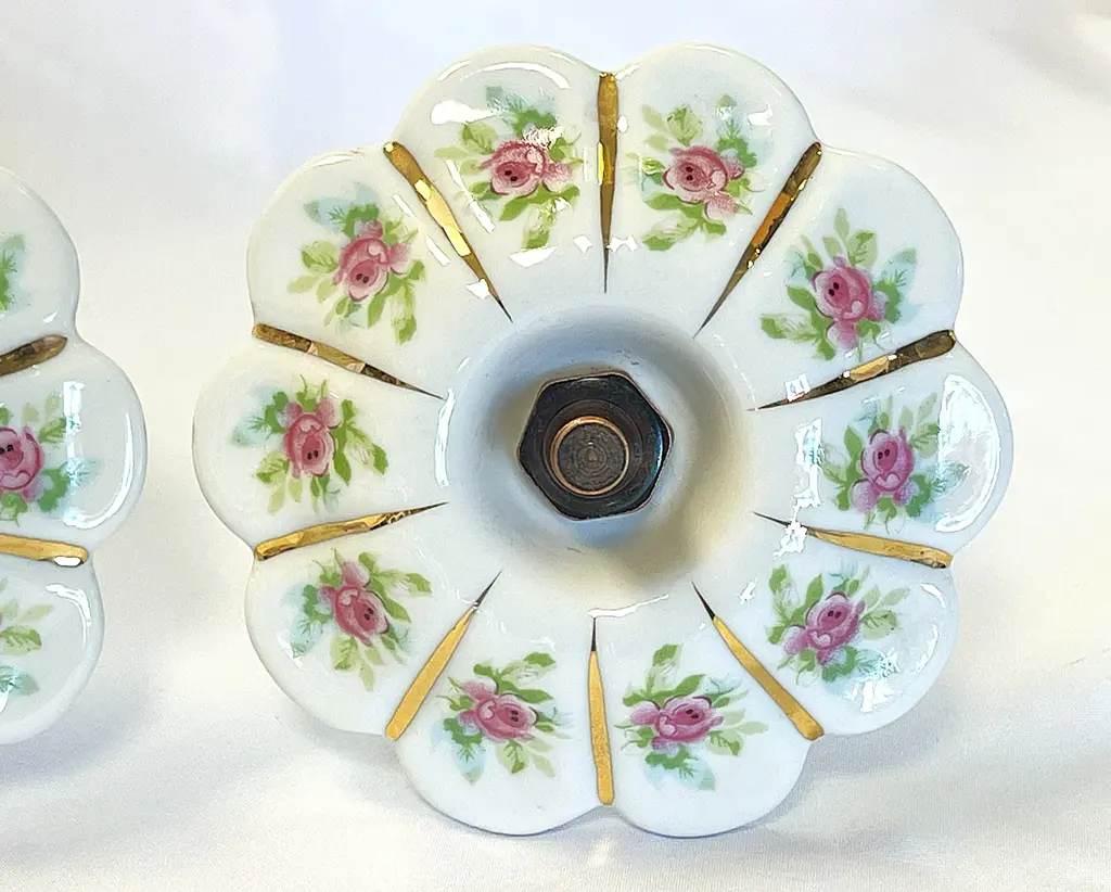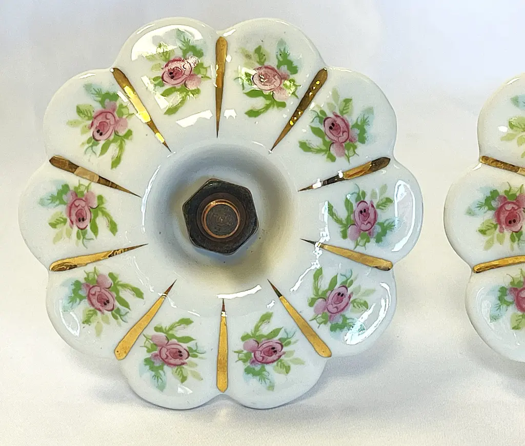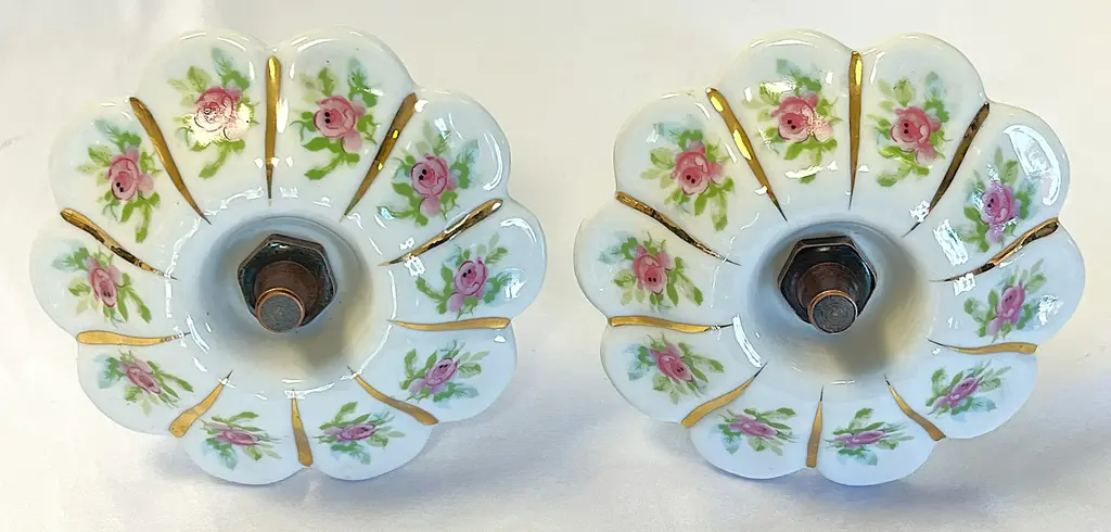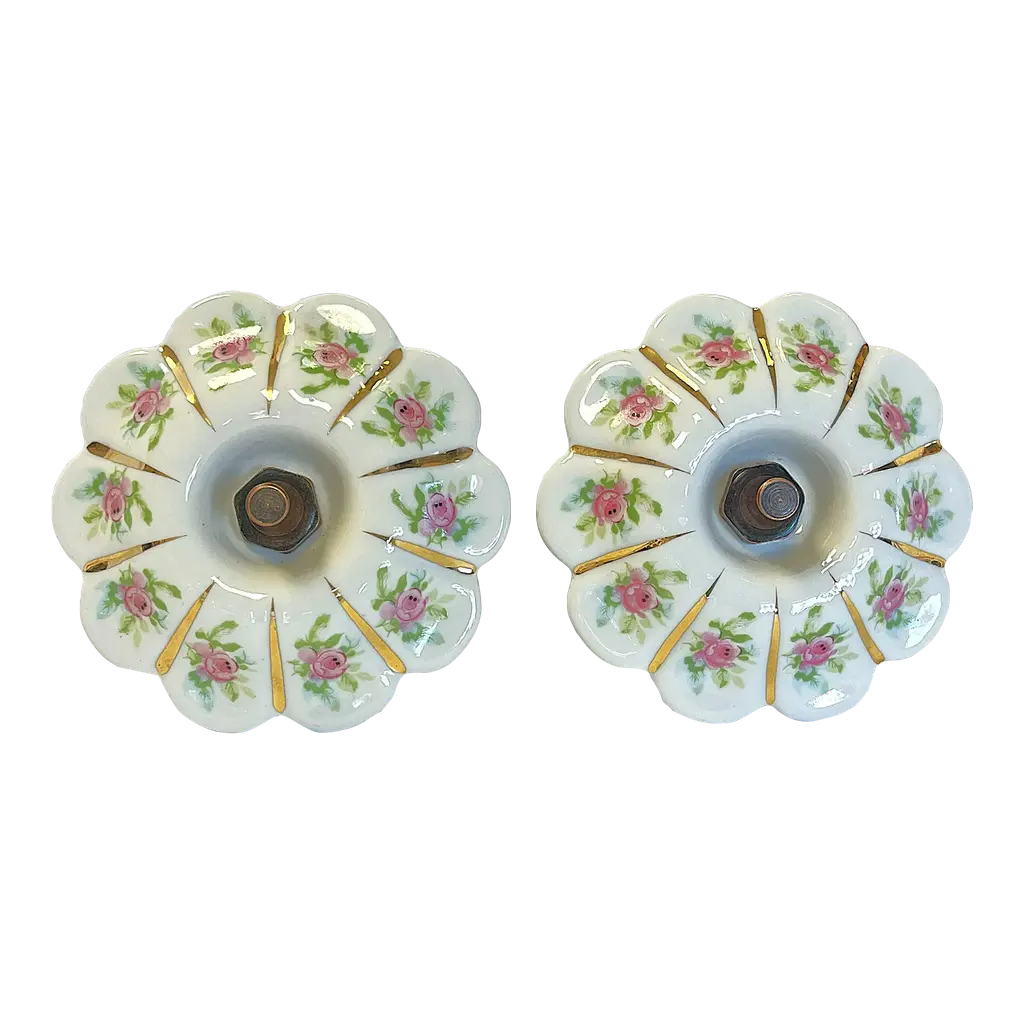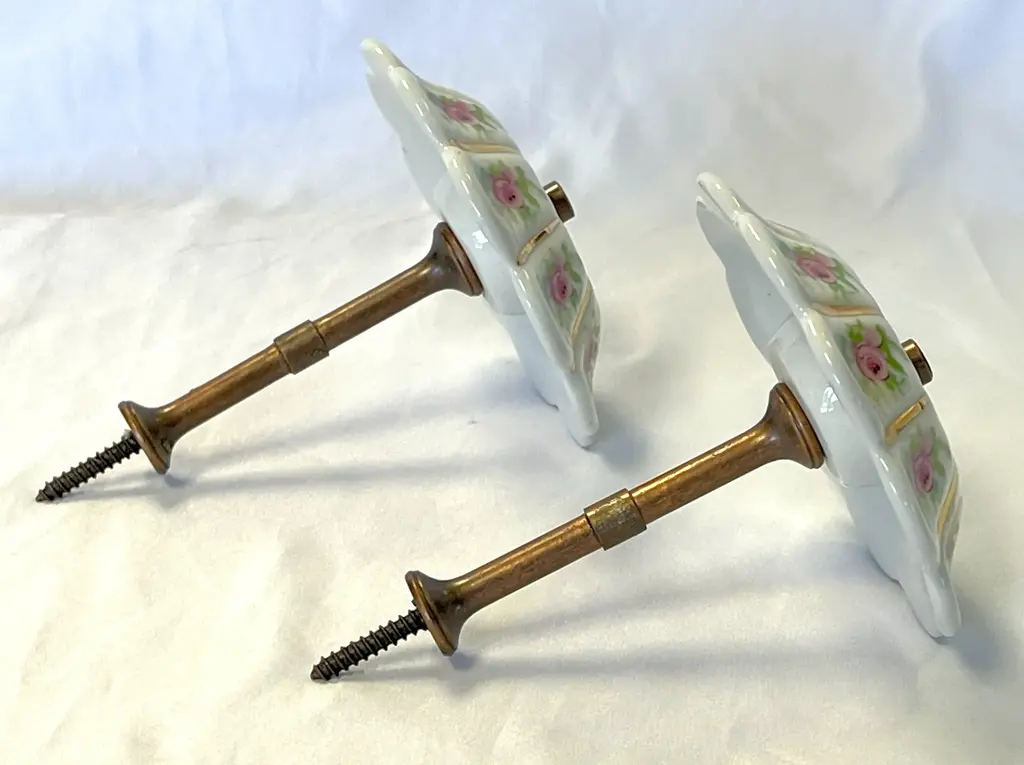 Wonderful vintage pair of porcelain curtain tiebacks. These have a Victorian style and are decorated with hand painted pink flowers and gold accents. They have bronze hardware and are ready to install. The porcelain is 4" diameter with a 4" spindle with 1" attached screw. A great finishing touch for drapery in any room of your home. There are 8 available being sold in pairs (all eight shown in last two photos).
