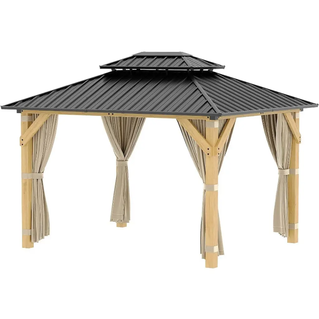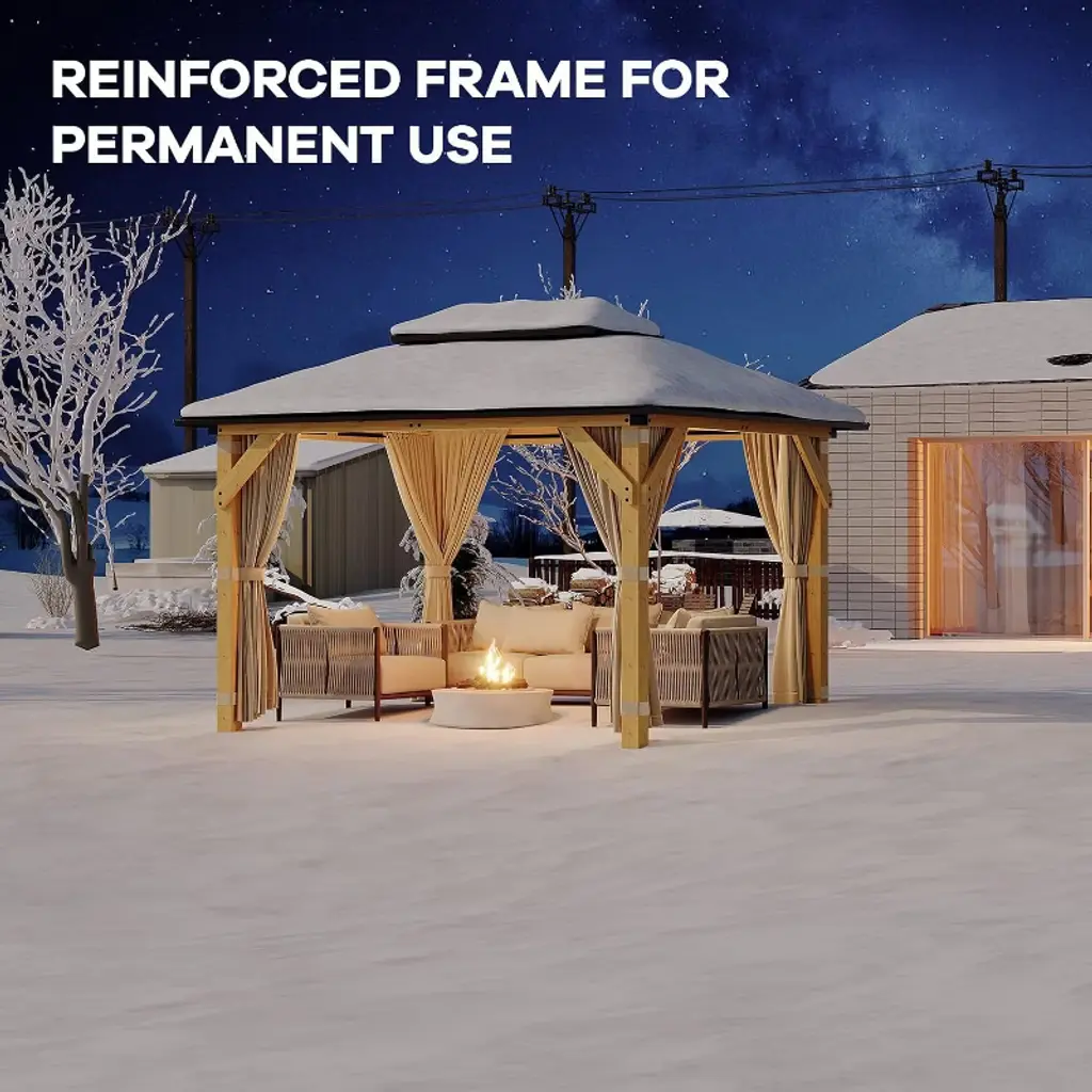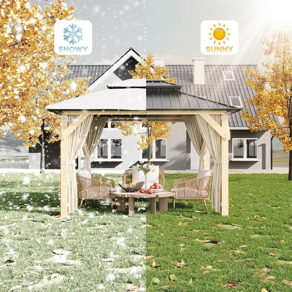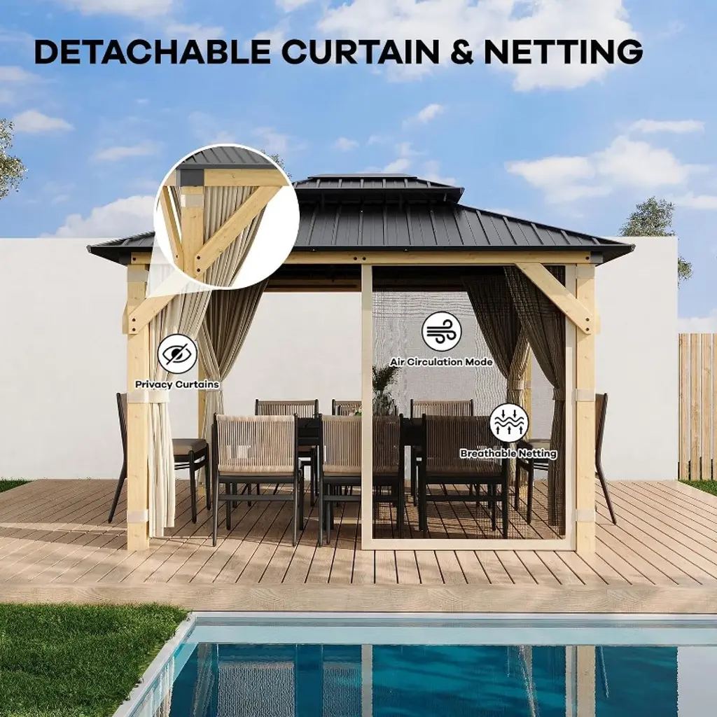 10 x 12 Ft Wood Gazebo, Upgrade Wooden Frame, Double Galvanized Steel Roof, Hardtop Gazebo with Nettings and Curtains for Backyard, Patio, Garden and Lawn