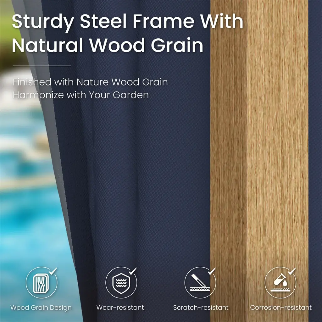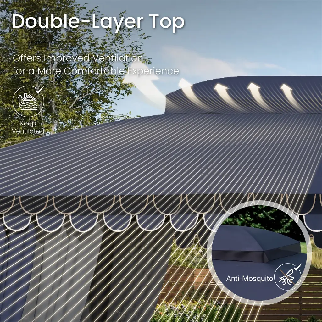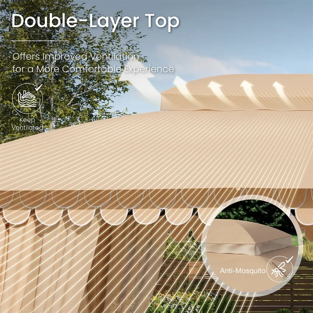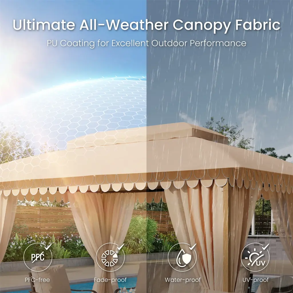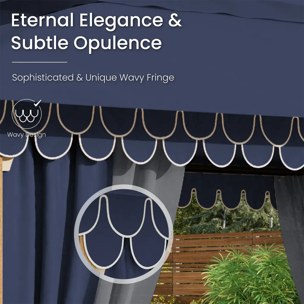 Elevate your outdoor relaxation with our elegant Patio Gazebo, expertly crafted to blend style and practicality. With its gracefully curved design and sturdy steel frame adorned with natural wood grain, this gazebo not only provides a sophisticated aesthetic but also offers reliable protection against sun and rain. Enjoy enhanced privacy and mosquito protection, making it the ideal retreat for gathering with friends and family in any weather!