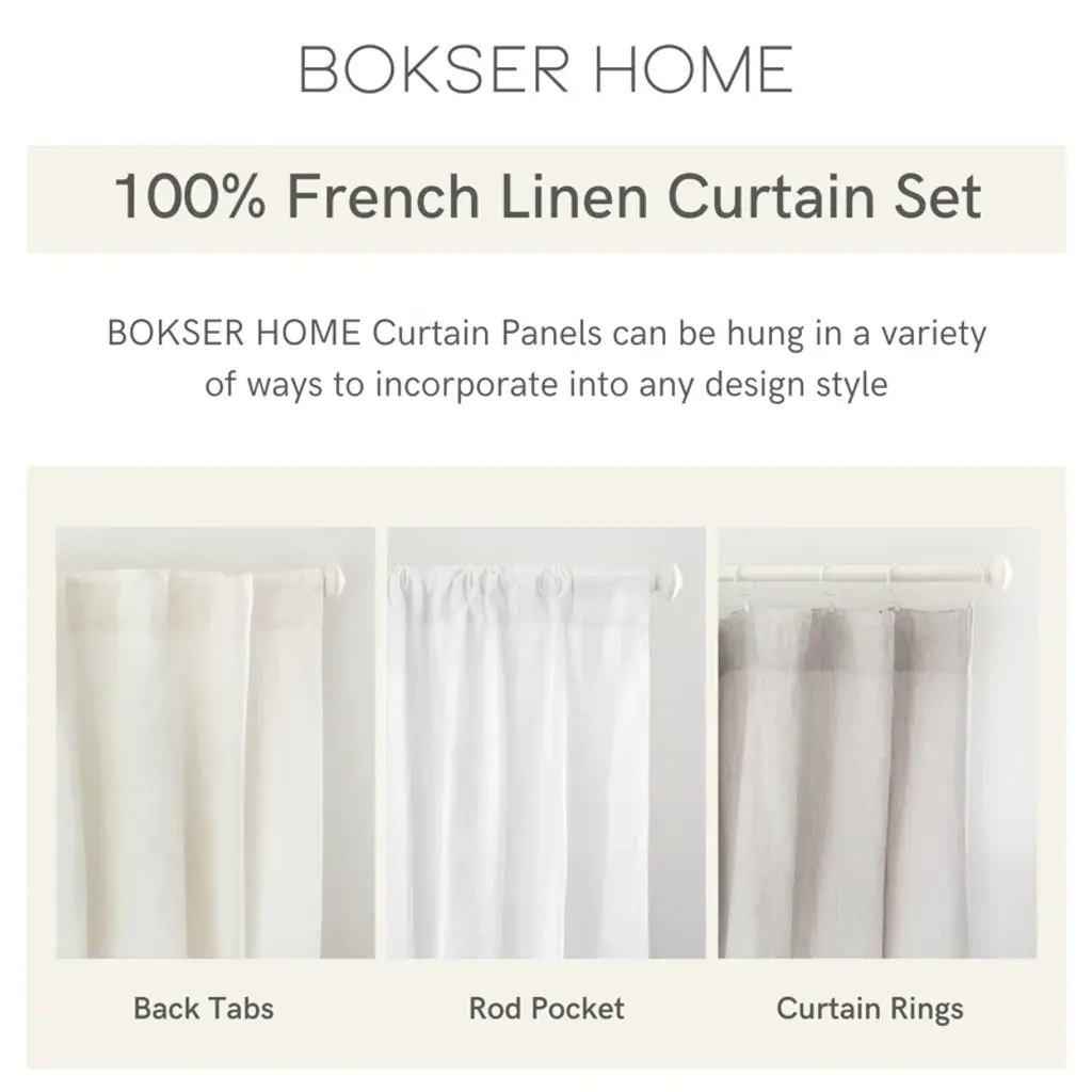 Filter the bright morning sun with BOKSER HOME's French Linen Window Curtains.This set of two panels features rod pockets and back tabs for versatile installation. Backed with a 100% cotton liner, they let in just the right amount of light while ensuring privacy. Available in three lengths and neutral colors, these curtains are sold as a set of two. Crafted from sustainable French flax, they combine exceptional durability with eco-conscious production. Dry cleaning is recommended. Explore BOKSER HOME's complete 100% French Linen Collection, including bedding and more. To keep you safe from harmful substances, all of BOKSER HOME's products have been independently tested and certified OEKO-TEX® STANDARD 100, 21.HUS.73741, Hohenstein HTTI.