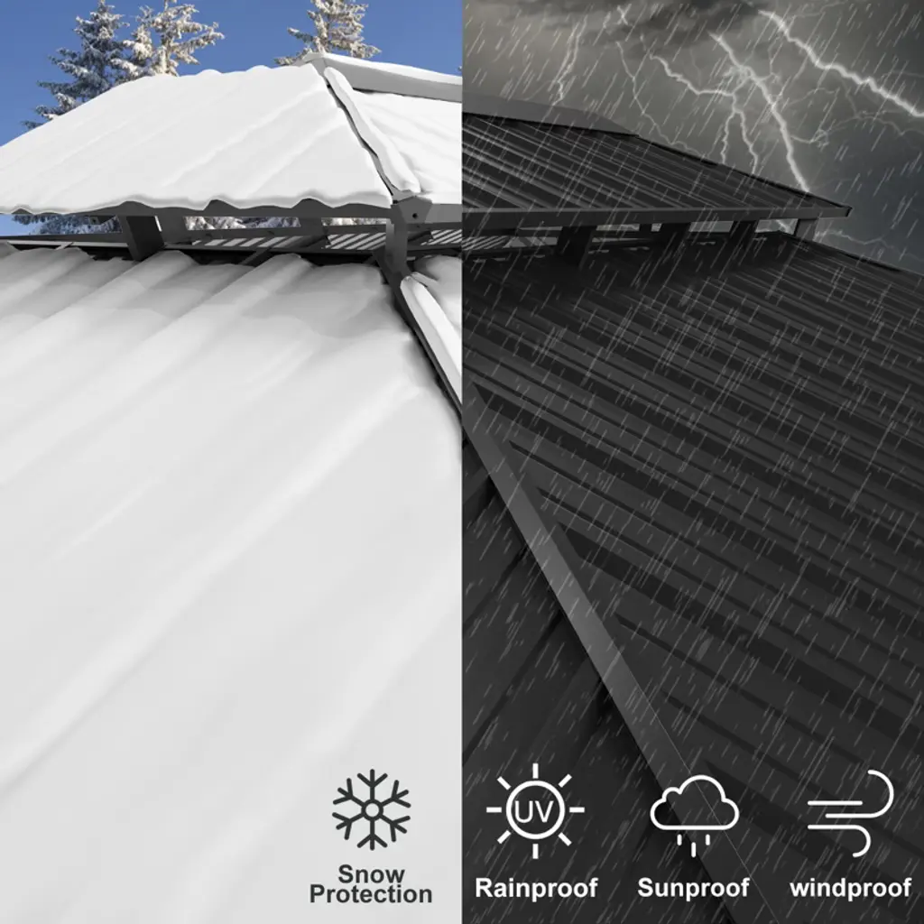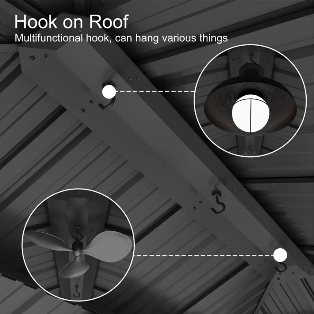 This 12x12FT hardtop gazebo features a strong aluminum frame and galvanized steel roof, ensuring durability and stability. The ventilated double roof improves airflow and wind resistance. With a UPF 50+ coating, this gazebo canopy blocks UV rays and is waterproof for light rain. It includes zippered mesh and curtains for privacy and bug protection. Ideal for patios, gardens, and events, this metal gazebo is easy to install with all accessories included. A stylish and durable choice for those looking for gazebos on clearance.