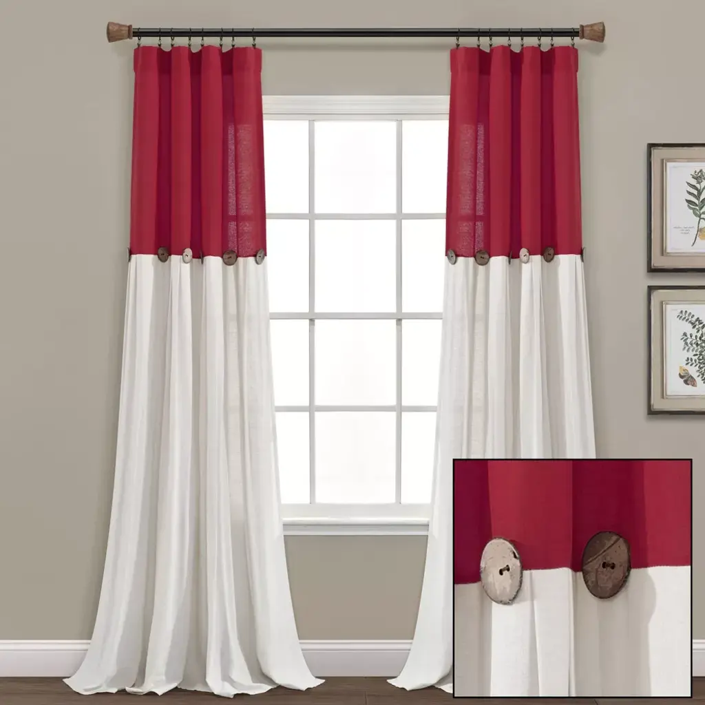 Add the look of linen to your home with our charming Linen Button Window Curtain. This single panel is perfect for your farmhouse styled home with the modern color block design, pleating, and coconut husk button details. Slight weave variations are authentic to this natural fiber blend and create a one-of-a-kind look. This rustic window curtain panel works well for your bedroom, living room, dining room, or dorm room. The charming rustic vibe of these curtains & drapes will enhance your decor but won't take over the look of your space. These long curtains for living room are light filtering, providing privacy while helping to filter sunlight, allowing a soft glow to fill the room. This country curtain is crafted from a linen-textured cotton fabric blend of 52% Polyester, 37% Cotton, and 8% Viscose. The 6 coconut husk buttons add rustic charm to your space while providing a handcrafted feel. Please note this curtain is sold by the single panel. No matter which color or length you choose, each panel measures 40 inches wide, with some panels offered in a width of 100 inches. Our Linen Button window panel offers seamless installation with its 3" rod pocket, allowing you to easily slide it onto your curtain rod, or by using clip rings (not included). This curtain is easy to care for, simply machine wash cold on the gentle cycle and tumble dry on low. If needed, use a non-chlorine bleach for cleaning or an iron on low heat to release wrinkles. Please refer to the label for full care instructions.
