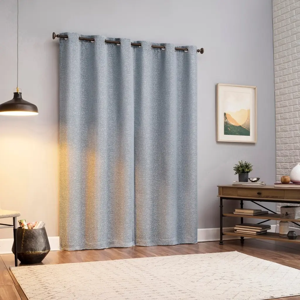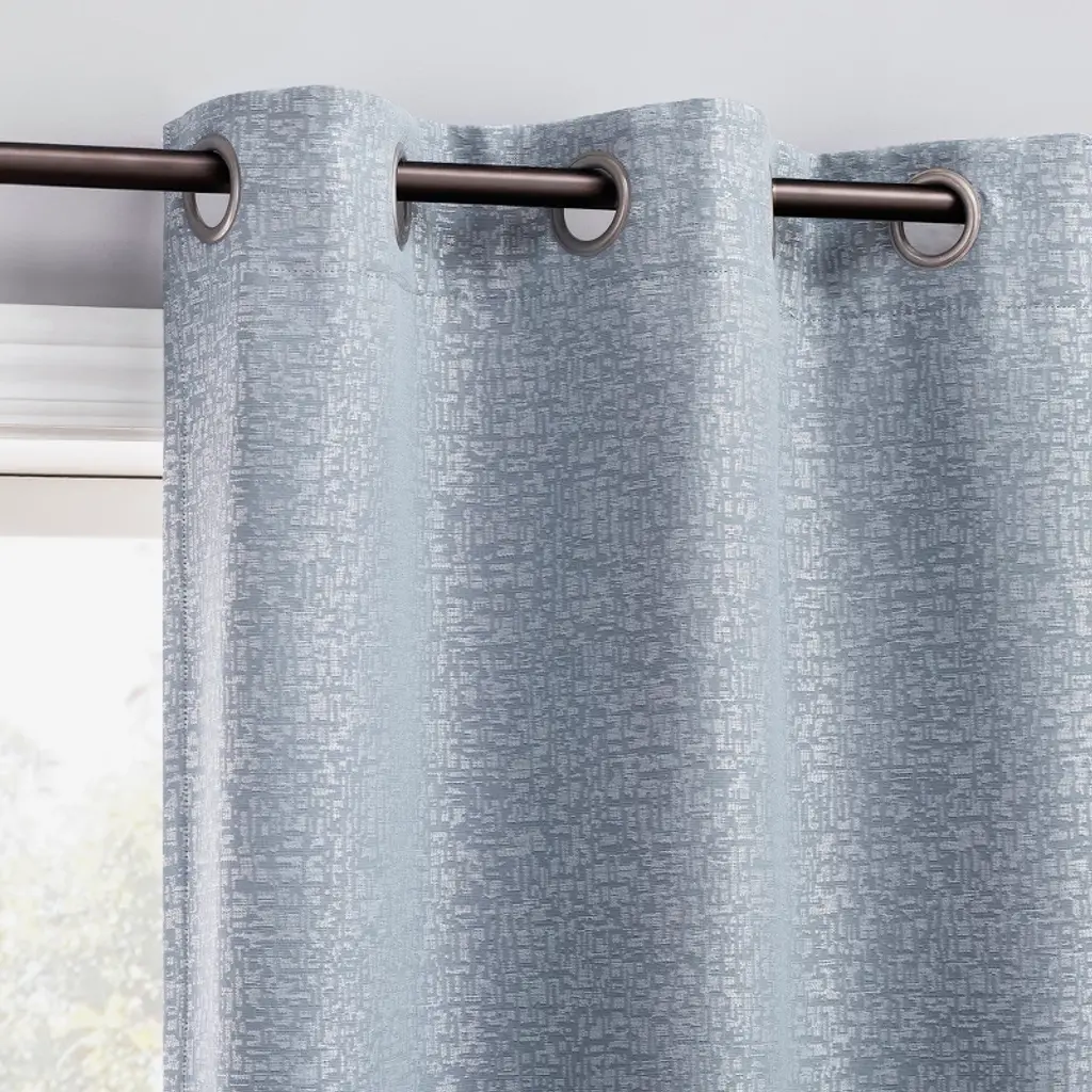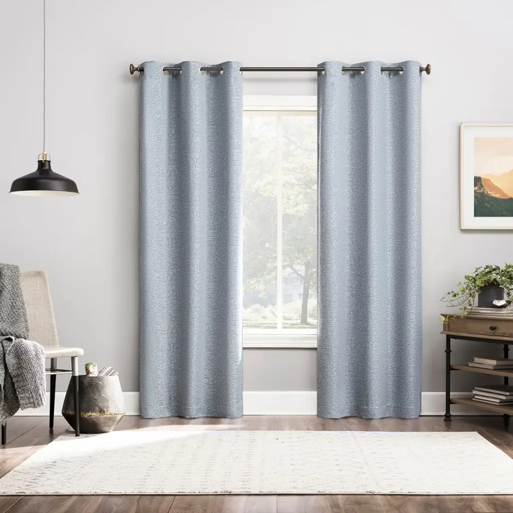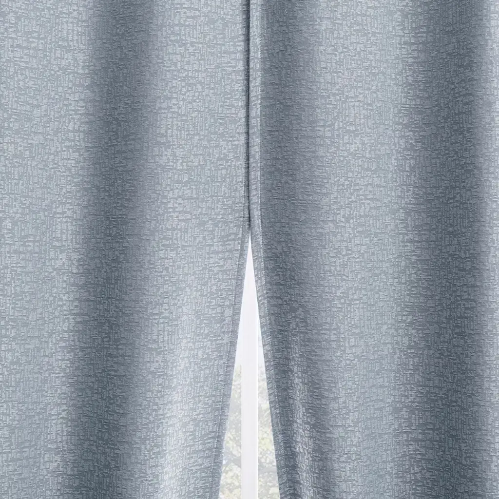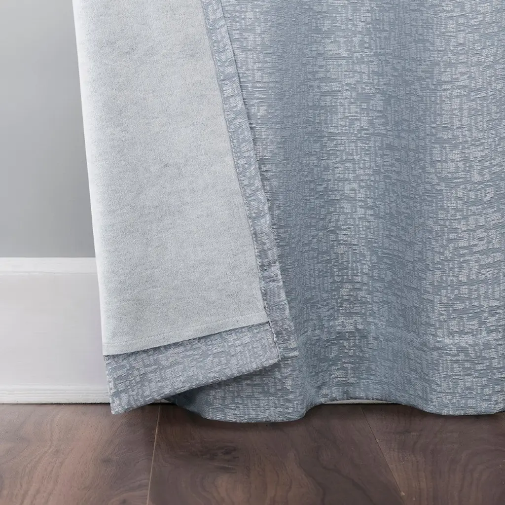 Add intrigue to any room of your home with the woven abstract geometric raised texture of Serenity Curtain Panel Pairs by Sun Zero. Total Blackout technology with dual magnetic closures blocks out 100% of outside light. . . Grommet top design allows for easy hanging on a standard curtain rod up to 1.5" in diameter. Pair includes two (2) panels. Measure carefully prior to purchase. Pair includes 2 light blue panels, each measuring 36" width by 63" length. Measure carefully before selecting your desired size and quantity. Rod not included. Machine wash cold on gentle cycle. Use only non-chlorine bleach when needed. Tumble dry on low heat, using a cool iron as needed.