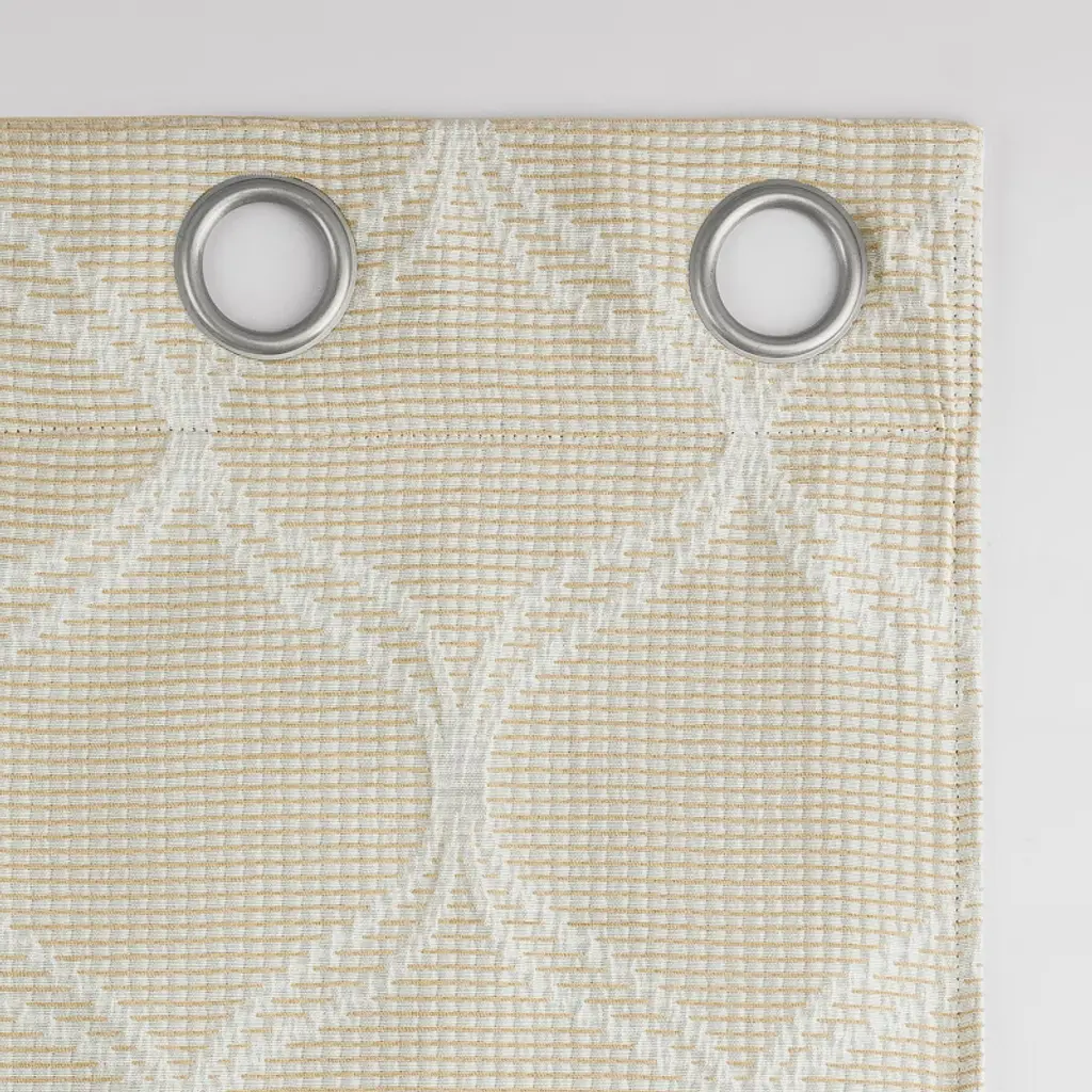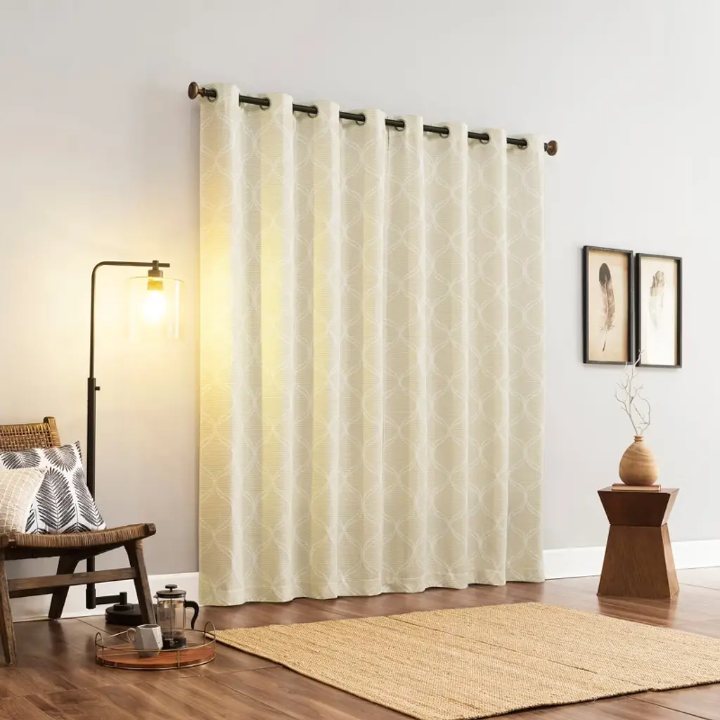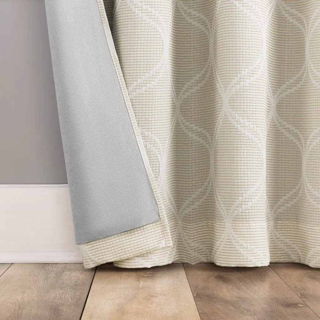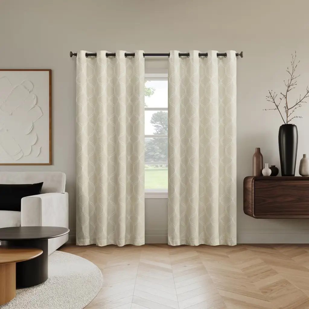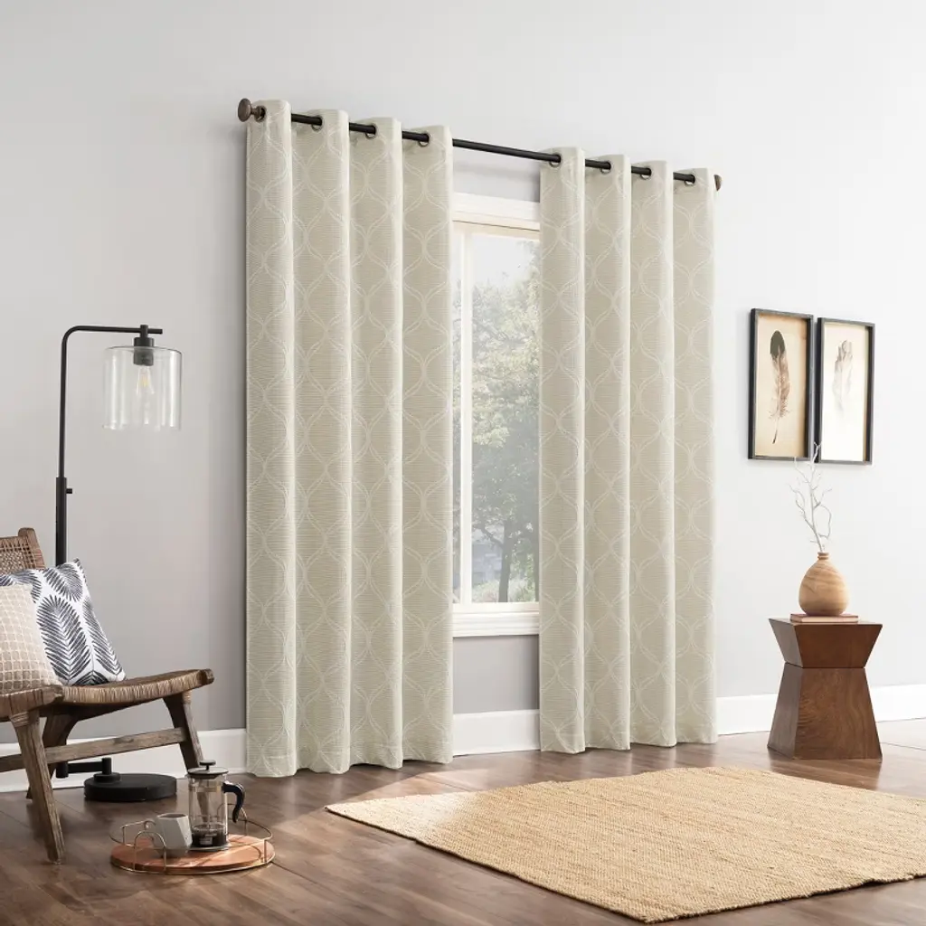 Add dimension to any room of your home with the woven ogee design of Tikal Curtain Panels by Sun Zero. Total Blackout technology blocks out 100% of outside light. Grommet top design allows for easy hanging on a standard curtain rod up to 1.5" in diameter. Panels sold individually. Measure carefully prior to purchase (Image features 2 panels). Sold as individual panels measuring 50" width by 84" length in color beige. Measure carefully before selecting your desired size and quantity. Rod not included. Machine wash cold on gentle cycle. Use only non-chlorine bleach when needed. Tumble dry on low heat, using a cool iron as needed.