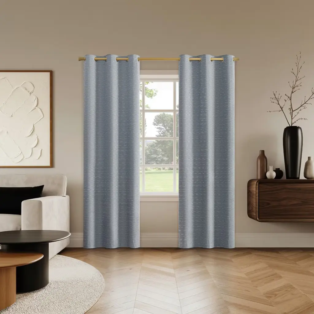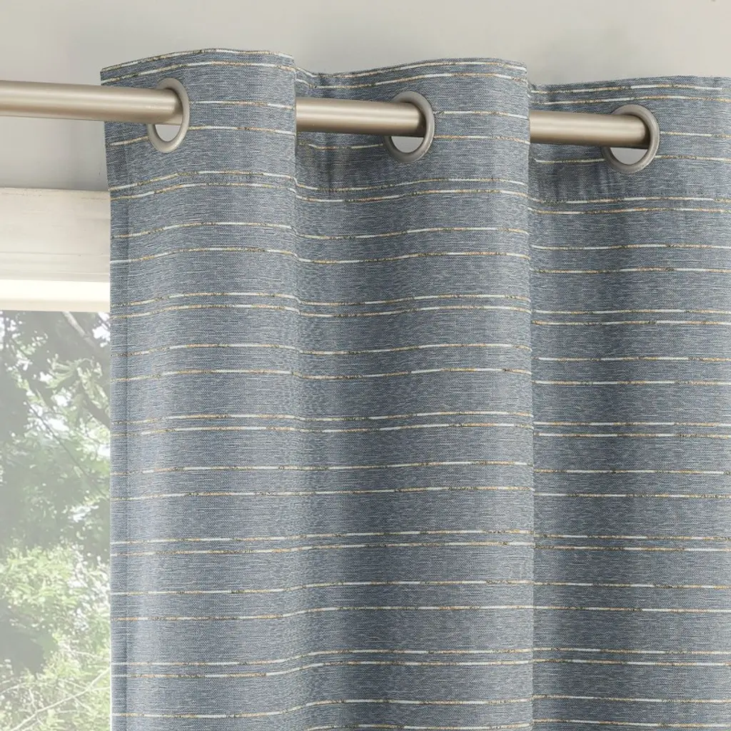 Add sophistication to any room of your home with the horizontal slub stripe design detail of Dresden Curtain Panel Pairs from Sun Zero. Total Blackout technology with dual magnetic closures blocks out 100% of outside light. . . Grommet top design allows for easy hanging on a standard curtain rod up to 1.5" in diameter. Pair includes two (2) panels. Measure carefully prior to purchase. Pair includes 2 denim blue panels, each measuring 37" width by 63" length. Measure carefully before selecting your desired size and quantity. Rod not included. Machine wash cold on gentle cycle. Use only non-chlorine bleach when needed. Line dry, using a cool iron as needed.
