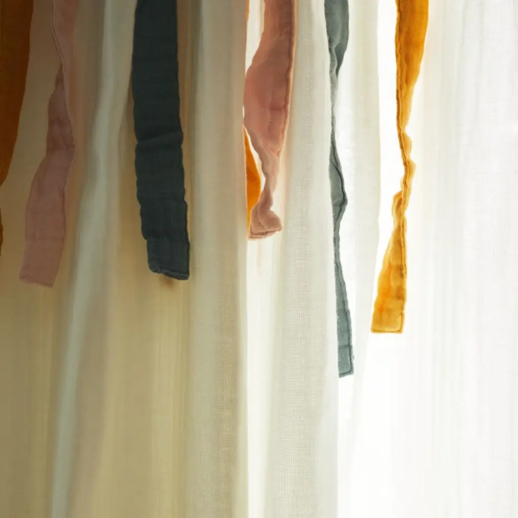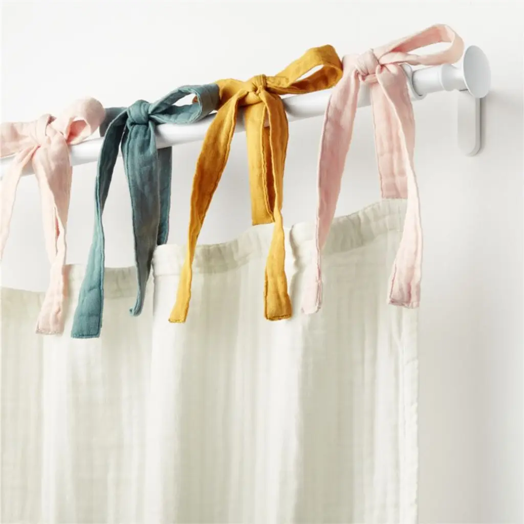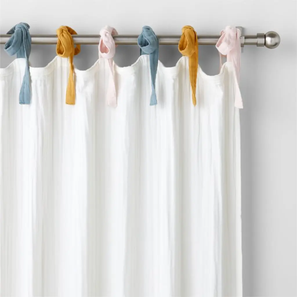 Easy to coordinate in kids rooms and nurseries, this curtain is made from sheer white cotton muslin with a super soft hand-feel and dreamy texture. The pretty ties up top supply a hint of sweet color and playfulness. Plus, the curtain's kid-friendly fabric is conveniently machine washable. (Score for the parents!)