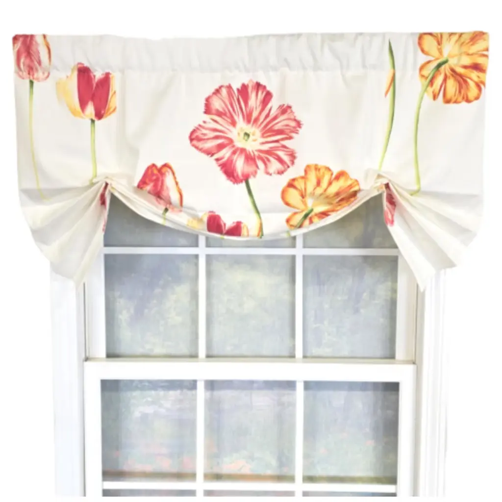 Bring the gorgeous sights of Spring indoors. Our traditional hydrangea pattern on high quality fabric will drape beautifully and bring a breath of fresh air into the entire room. Abigail is a multi colored traditional Hydrangea floral print pattern on solid natural colored ground that features a range of shades and colors that coordinate easily with a variety of solids and patterns within your home. Made with 52-percent polyester/48-percent 5-ounce cotton fabric creates a smooth draping effect, soft texture and easy maintenance. Tie-Up Valance is a one-piece valance that includes two strap ties and a decorative 3-inch rod pocket for easy hanging. Width is measured overall 60-inches, length is measured overall 22-inches from header to bottom hem. For wider windows simply add multiple valances together. Tie-Up Valance can be used with matching Abigail Tailored Panels with Tiebacks and Tailored Tiers for a custom look. Matching Abigail Valances, Panels, Tiers and Shower Curtain also available. Machine washable.