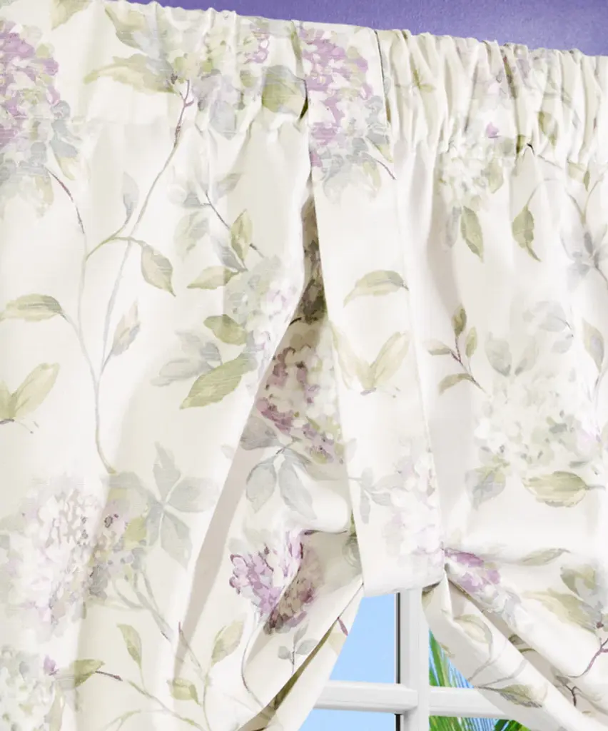 Bring the gorgeous sights of Spring indoors. Our traditional hydrangea pattern on high quality fabric will drape beautifully and bring a breath of fresh air into the entire room. Abigail is a multi colored traditional Hydrangea floral print pattern on solid natural colored ground that features a range of shades and colors that coordinate easily with a variety of solids and patterns within your home. Made with 52-percent polyester/48-percent 5-ounce cotton fabric creates a smooth draping effect, soft texture and easy maintenance. Tie-Up Valance is a one-piece valance that includes two strap ties and a decorative 3-inch rod pocket for easy hanging. Width is measured overall 60-inches, length is measured overall 22-inches from header to bottom hem. For wider windows simply add multiple valances together. Tie-Up Valance can be used with matching Abigail Tailored Panels with Tiebacks and Tailored Tiers for a custom look. Matching Abigail Valances, Panels, Tiers and Shower Curtain also available. Machine washable.