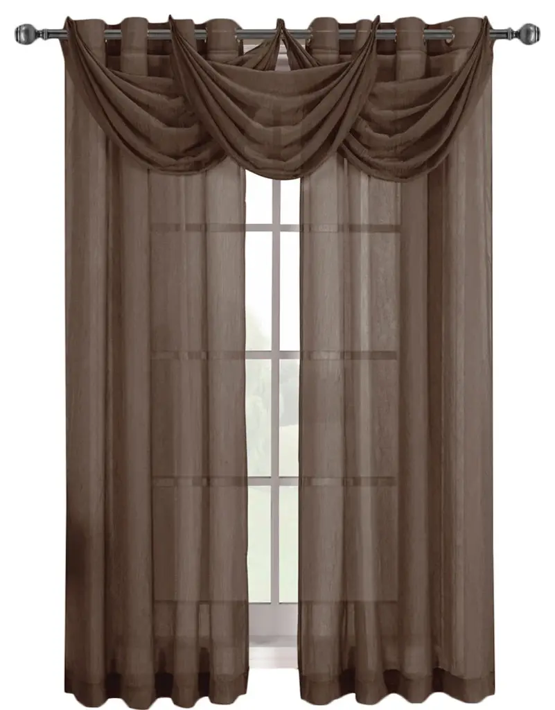 Add an opulent and deluxe look to almost any room in the house with this Grommet Sheer Curtain Panels by Abripedic. Opt from the seven delightful different colors available that perfectly complements any room. Have an informal appearance with the panels only or add more elegance with one or more waterfall valances. Add the valance scarf to complete the look. See-through and delicate, the Abripedic Grommet Crushed Sheer Curtain Panel looks dreamy blowing in the breeze. These long, sheer curtains can be hung alone or under solid drapes. •100% polyester Sheer Curtains•Sold individually (Not a set, each package contains only one panel or one valance)•Allows light to softly enter the room•Crushed sheer creates fresh & rich atmosphere•Ability to mix and match different color valances with other colored panels •Machine-washable Easy CareAvailable Sizes Include: (Not a set, Sold as single panel or single valance)•24 " wide x 24 " long each Valance•50 " wide x 63 " long each Panel•50 " wide x 84 " long each Panel•50 " wide x 96 " long each Panel•50 " wide x 108 " long each Panel