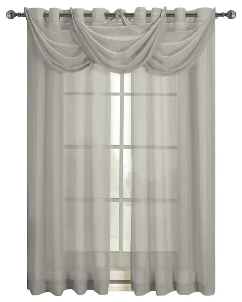 Add an opulent and deluxe look to almost any room in the house with this Grommet Sheer Curtain Panels by Abripedic. Opt from the seven delightful different colors available that perfectly complements any room. Have an informal appearance with the panels only or add more elegance with one or more waterfall valances. Add the valance scarf to complete the look. See-through and delicate, the Abripedic Grommet Crushed Sheer Curtain Panel looks dreamy blowing in the breeze. These long, sheer curtains can be hung alone or under solid drapes. •100% polyester Sheer Curtains•Sold individually (Not a set, each package contains only one panel or one valance)•Allows light to softly enter the room•Crushed sheer creates fresh & rich atmosphere•Ability to mix and match different color valances with other colored panels •Machine-washable Easy CareAvailable Sizes Include: (Not a set, Sold as single panel or single valance)•24 " wide x 24 " long each Valance•50 " wide x 63 " long each Panel•50 " wide x 84 " long each Panel•50 " wide x 96 " long each Panel•50 " wide x 108 " long each Panel